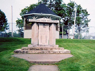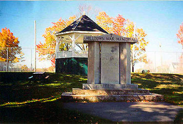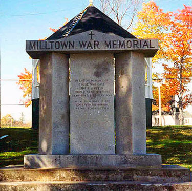 In 1955, President Ernest Hanson of Milltown Branch #48, Royal Canadian Legion proposed a Veteran's Memorial monument be erected in the community. A community drive to raise funds was successful and in September 1956 a dedication service was held. About 400 War Veterans and spectators attend the unveiling of the granite monument to honour those who paid the supreme sacrifice in the First World War, the Second World War and Korea. The monument was designed by Windsor Dewar, of Milltown, N.B. and constructed by Kenneth Fitzgerald, stone mason from St. Stephen, N.B. The monument is made of grey granite and came form the quarry at the Ledge, a rural area of St. Stephen.