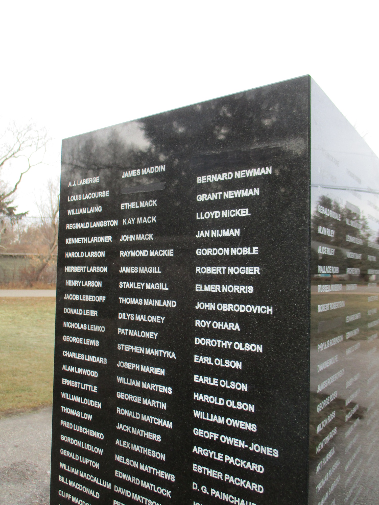 In 2010, Montgomery Place Community Association president Barb Biddle undertook the task of compiling names of veterans who built or bought homes in Montgomery Place between 1946 and 1977 under the Veterans Land Act soldier settlement program. Through the research, 563 names were gathered. A ceremony was held on June 22, 2013 for the dedication of this monument which is located adjacent to the Memorial Cairn.