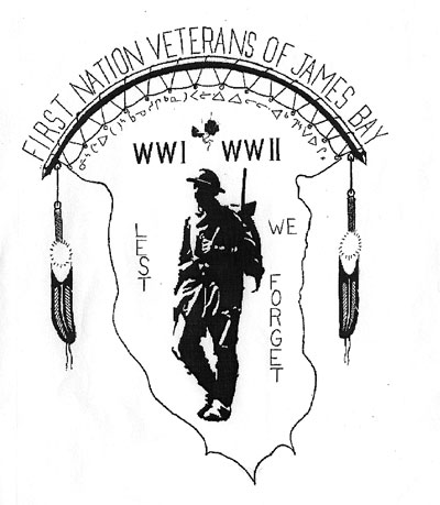 The First Nation Veterans of James Bay logo on front and back (centred) and LIONS CLUB logo (biggest donator) on back of monument.
