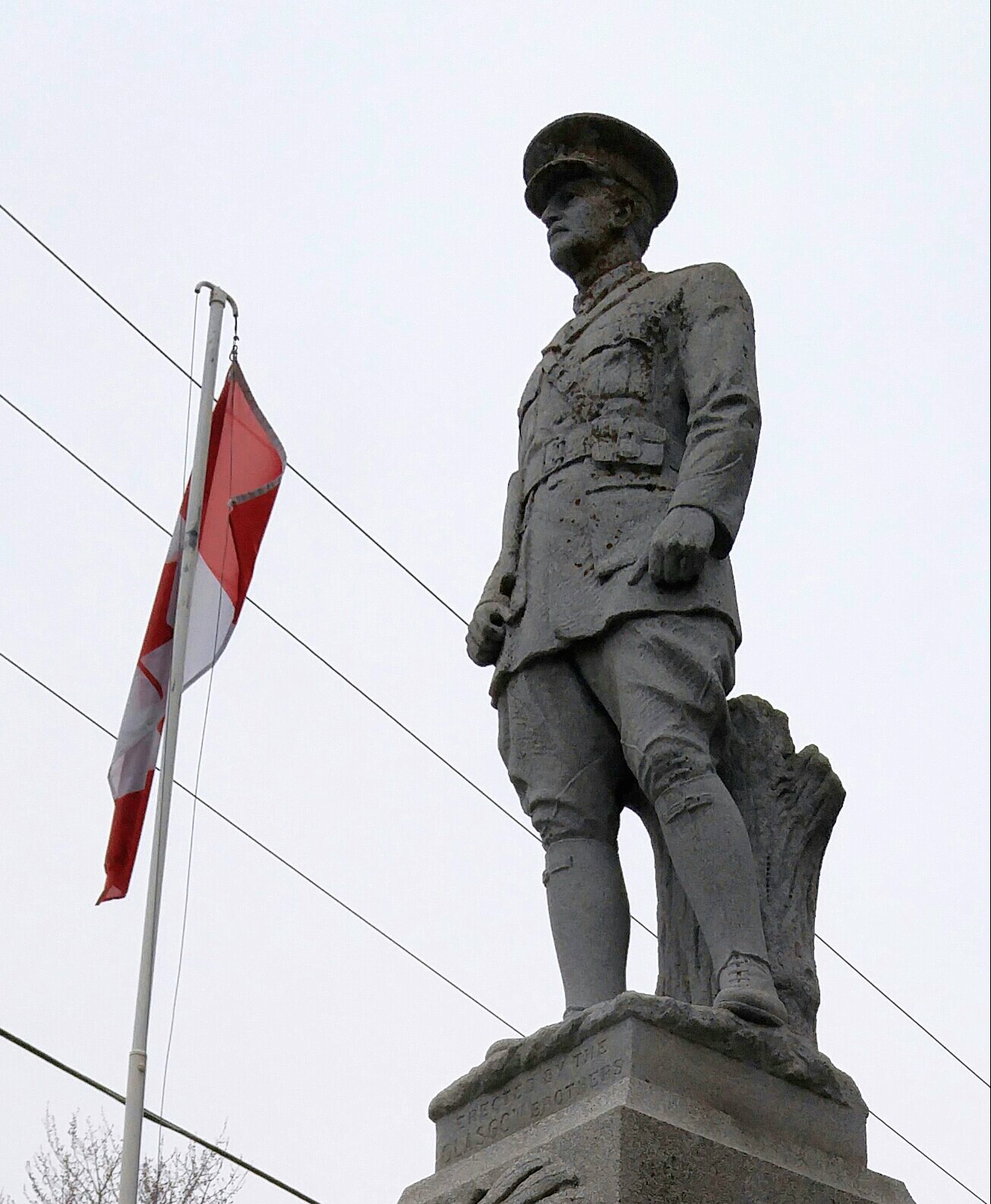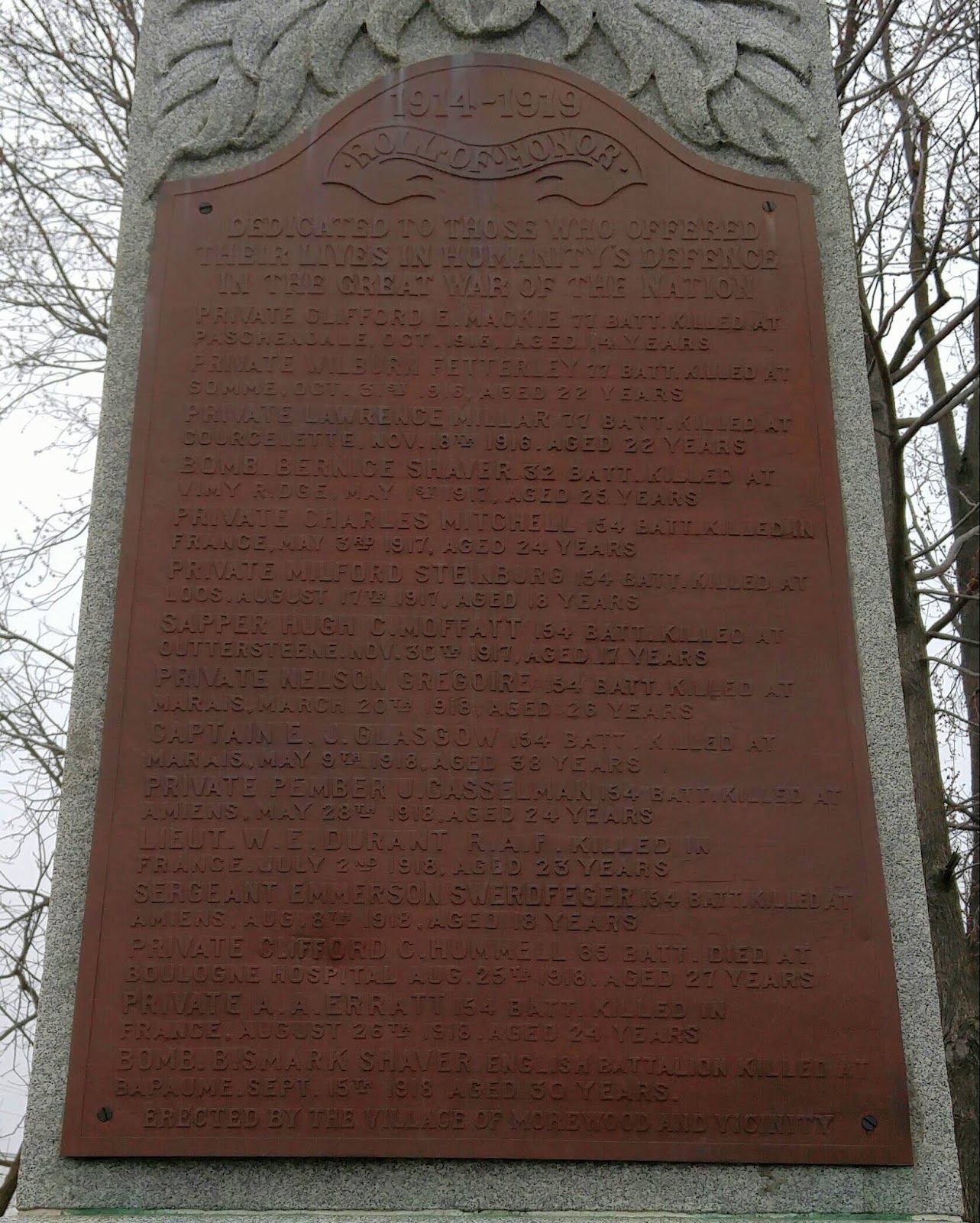A Cenotaph Committee of local volunteers was formed in 1919, it was incorporated, the small corner lot in the middle of Morewood was purchased, four blocks of granite and a statute were commissioned, made, delivered and installed in early 1921. The members of the Morewood Cenotaph Committee and the First Directors of the Corporation were Allan Smirle, William Bouck, Albert Glasgow, Ezra Countryman, and Hector Carruthers.