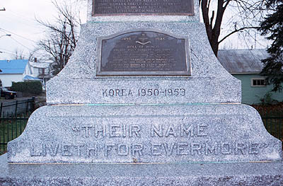 During the Second World War, four more young area men lost their lives and their names were added on another plaque. When the cenotaph was first unveiled and the Second World War plaque was not present - the text in that spot reads "Lest we Forget". Later the Korean War dates were inscribed to recognize those who served during that war.