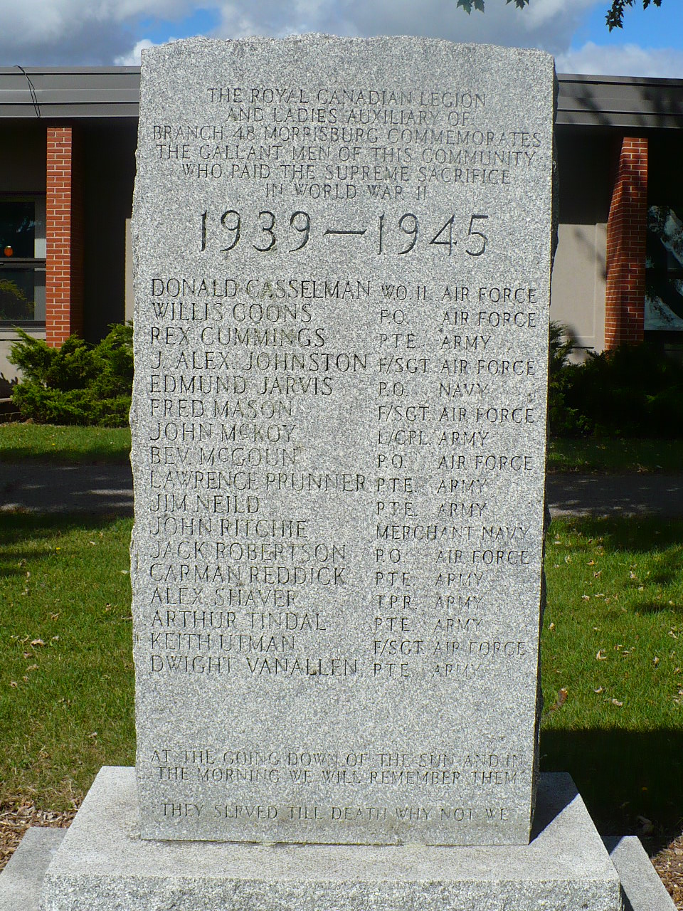 | THE ROYAL CANADIAN LEGION AND THE LADIES AUXILIARY OF BRANCH 48 MORRISBURG COMMEMORATES THE GALLANT MEN OF THIS COMMUNITY WHO PAID THE SUPREME SACRIFICE IN WORLD WAR II |