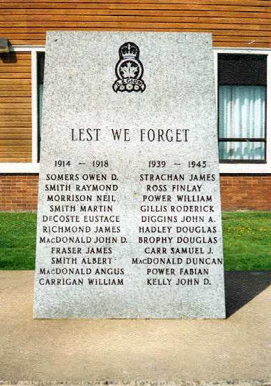 A granite Cairn erected in 1983 to replace a previous one with the names of 11 men who made the supreme sacrifice in 1914-1918 and the names of 11 men from 1939-1945.