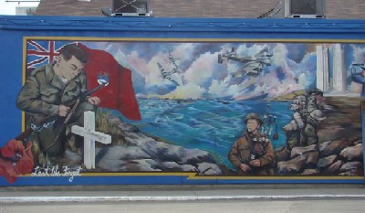 This mural, "Mural of Tribute", by artists Michelle Loughery and Sarah Lindsay, was sponsored and developed by the Royal Canadian Legion Branch #167, Lumby. Starting from the left is the most important scene – a soldier kneeling at a cross, marking the final resting place of a fallen comrade. At is feet is the Poppy of Remembrance and the words “Lest We Forget”. Above him is the Red Ensign, Canada’s flag for many years. The rocks symbolize the hardships, sorrows and defeats that had to be overcome on the way to victory. The landing scene has two Second World War fighter planes and a Lancaster bomber of the Royal Canadian Air Force. Beneath them are the landing craft and the corvettes of the Royal Canadian Navy, while in the foreground is a ship of the Merchant Marine. Advancing is a piper that would be leading a file of men into battle. In the centre are First World War soldiers attacking Vimy Ridge. At the top, one can see the Vimy Ridge Memorial. Over the door are the representatives of two of the Women’s Services in the Second World War. Often forgotten is the tremendous contribution to victory by women in both World Wars. To their right is a ruined city, a graphic reminder of the cost and horror of war. Below the city is a mobile Salvation Army canteen, representing all the wonderful fraternal and religious organizations that helped the morale of our service men and women. Above and to the right are two soldiers of the South African War. Finally, at the right of the mural is a Canadian Peacekeeper in his United Nations uniform. Today, Canada is recognized throughout the world as a country that can be counted on. Our service men and women continue to make sacrifices in the efforts of peacekeeping. A dedication ceremony was held for the Memorial Wall on September 9, 2001. Well-known Vernon mural artist Michelle Loughery painted the Memorial Wall mural with assistance from Sarah Lindsay.