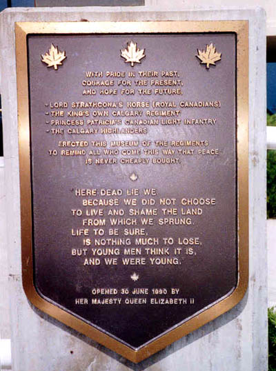 THE MUSEUM OF THE REGIMENTS IS DEDICATED TO THE MEMORY OF THE MEMBERS OF ITS FOUNDING REGIMENTS: LORD STRATHCONA'S HORSE (ROYAL CANADIANS), THE KING'S OWN CALGARY REGIMENT, PRINCESS PATRICIA'S CANADIAN LIGHT INFANTRY, AND THE CALGARY HIGHLANDERS WHO WERE KILLED ON ACTIVE DUTY. THEIR HEROIC LEGACY CONTRIBUTED TO THE RICH HERITAGE EARNED BY THEIR REGIMENTS FOR CANADA.