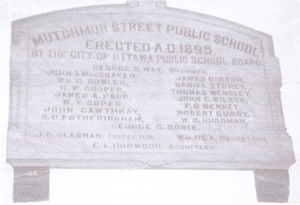 Mutchmor Public School was erected by the city of Ottawa Public School Board. The school was unveiled on December 23, 1895 and is dedicated to John Mutchmor, Veteran of the War of 1812.