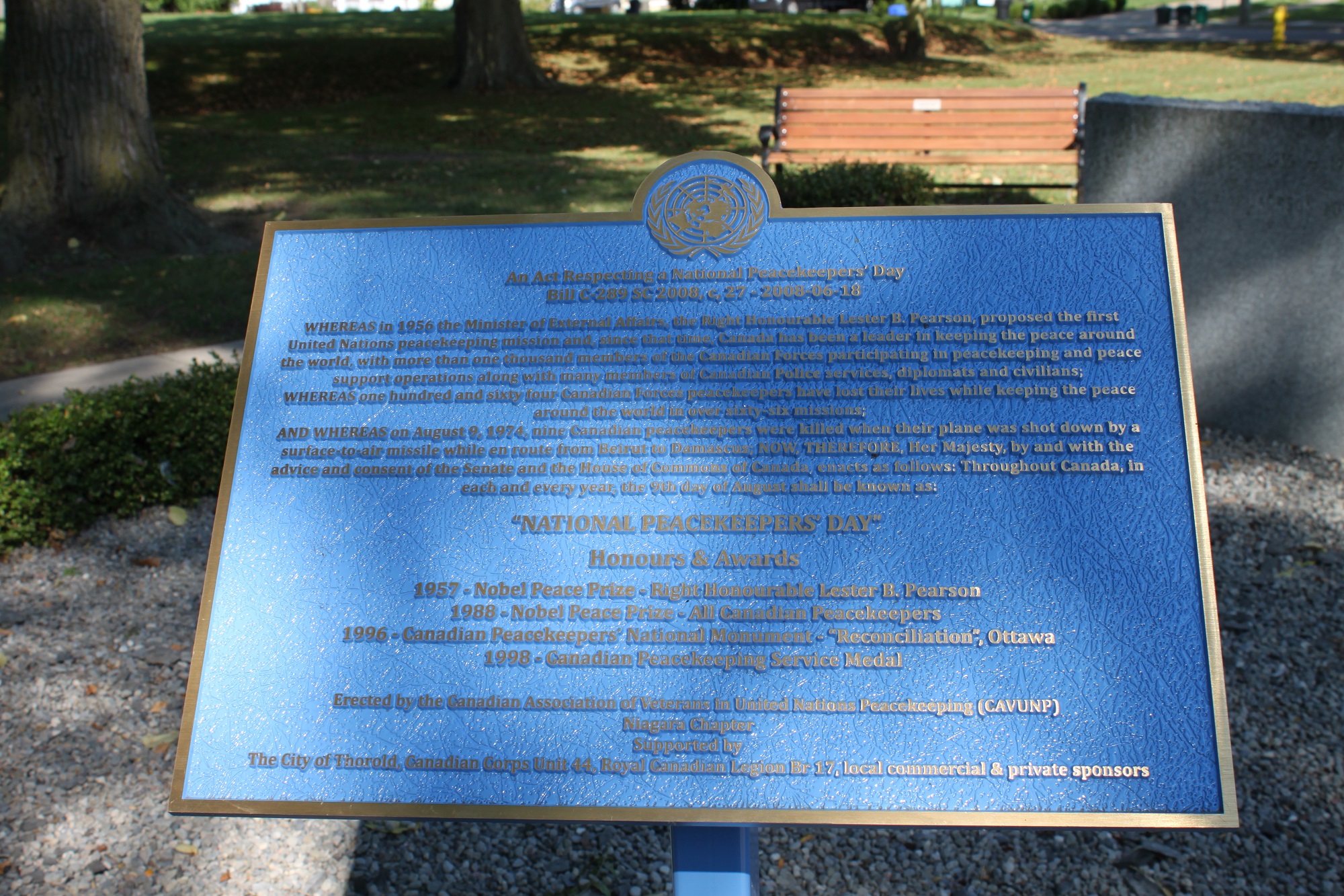 The National Peacekeepers' Day Plaque was unveiled on August 24, 2018. It was erected by the Canadian Association of Veterans in United National Peacekeeping Niagara Chapter with the support by the City of Thorold, Canadian Corps Unit 44, Royal Canadian Legion Br 17, local commercial and private sponsors.