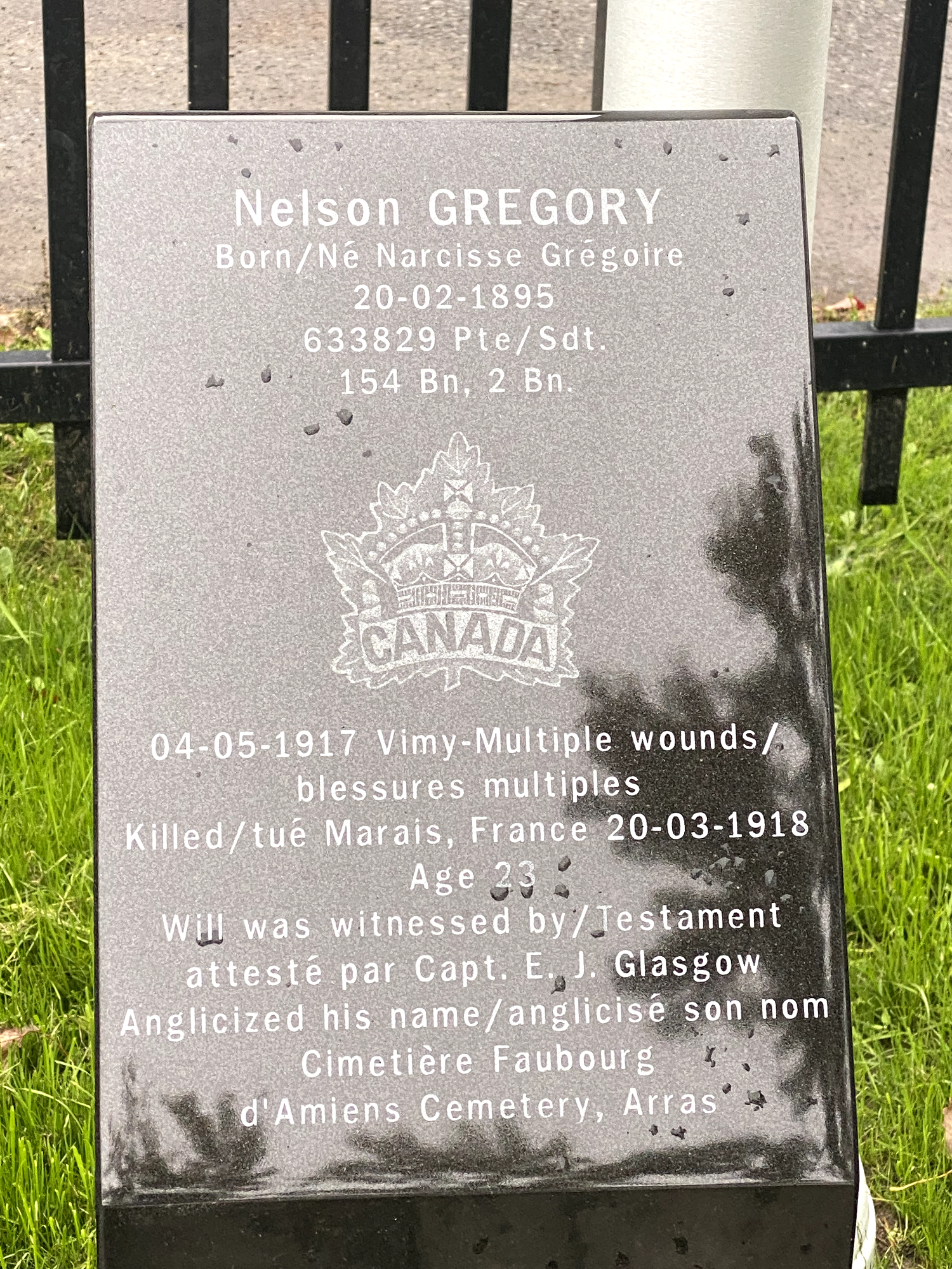 Nelson was a labourer before the war and stood 5 foot 9 inches, had dark hair and brown eyes. His name was anglicized from Narcisse Gregoire. Captain Glasgow witnessed his will on 10 October 1916 and Nelson sailed from Halifax on board the RMS Mauritania on 25 October 1916. On 4 May 1917, he received multiple wounds to his face and arms, was hospitalized in Halifax and discharged on 24 July 1917. He was hospitalized again 31 July 1917 for an old shrapnel wound in his shoulder and discharged 29 September 1917. Nelson was killed in action on 29 March 1918.