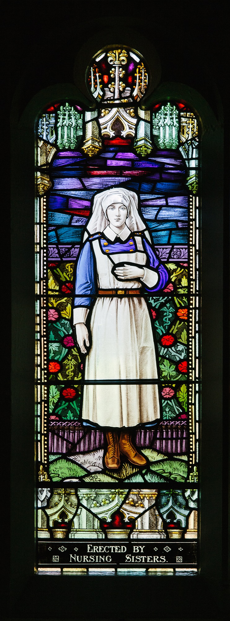 The Nurse was erected in Canadian Memorial United Church by Nursing Sisters of the First World War and dedicated by Captain the Reverend E.D. McLaren, MA, DD. The spiritual expression on the face of the nurse typifies sacrificial service. This window was held in special regard by the congregation because for years the surviving members of the Nursing Sisters attended their Remembrance Day service.