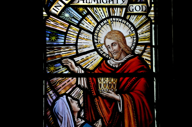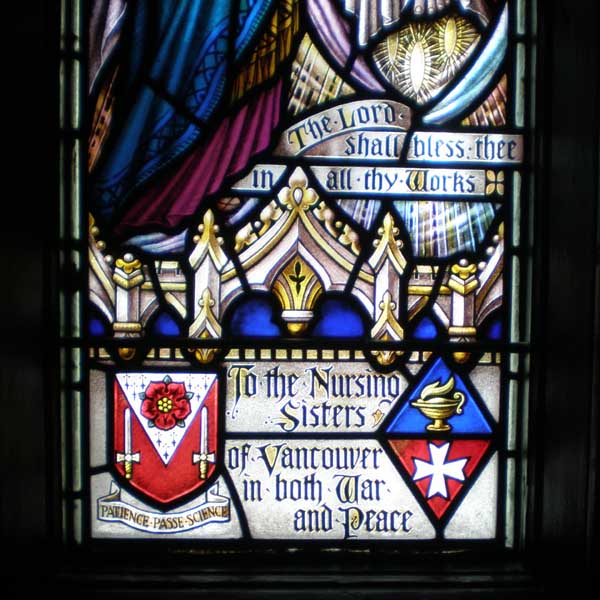 This window is dedicated to the Nursing Sisters of Vancouver both in War and Peace. At the top of this window is the crest of the Royal Canadian Army Medical Corps, and at the bottom right is the crest of the Vancouver General Hospital with the Maltese Cross.