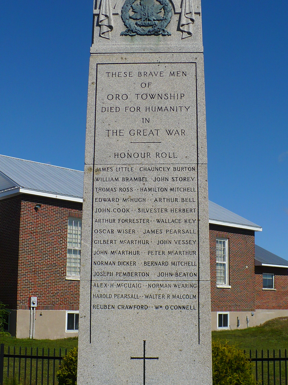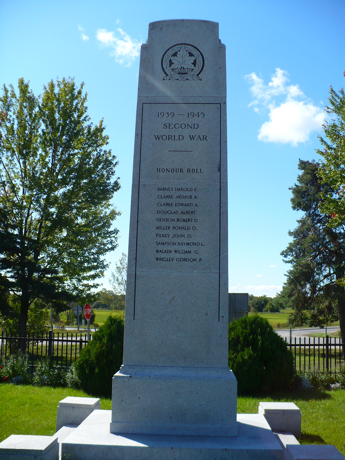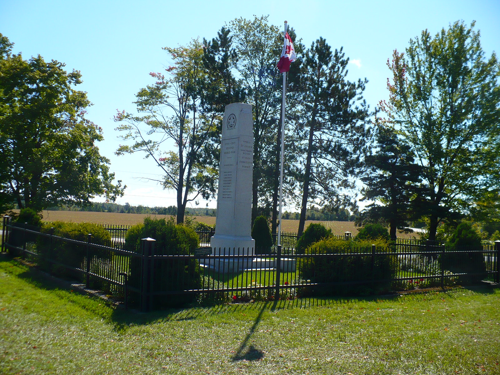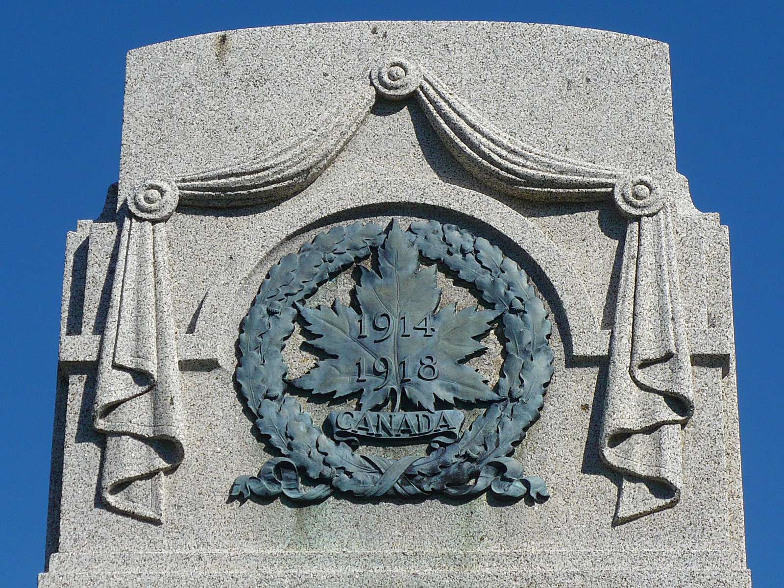 This cenotaph was built in 1921, a tall white marble shaft, dedicated to those you gave their lives in the First World War. A brass symbol of a Canadian maple leaf adorns the top.