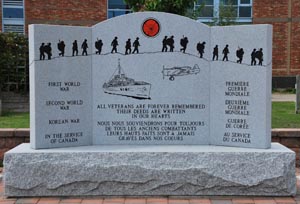 This memorial is dedicated to the Army, Navy, and Air Force Veterans of the First and Second World Wars, the Korean War and all Canadian Forces Veterans. Erected by Veterans, Veterans Residents Council and branches of the Royal Canadian Legion on November 1, 2006. The flags are lowered in respect for each Veteran who passes away in the home.