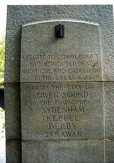 The Owen Sound Cenotaph was dedicated on December 1, 1920, in honour of those who gave their lives in the First World War. It was erected by the City of Owen Sound and the Townships of Sydenham, Keppel, Derby and Sarawak. Designed by Emanuel Hahn, water flows from the top of the cenotaph down the carved face of the column to a basin, with a frog resting above it, where it streams through decorative channels to a pool at ground level. At the top of the column a bronze dove holds an olive branch in its bill. On the face of the monument, there is a line from the poem “For the Fallen” composed by English poet Laurence Binyon in 1914.