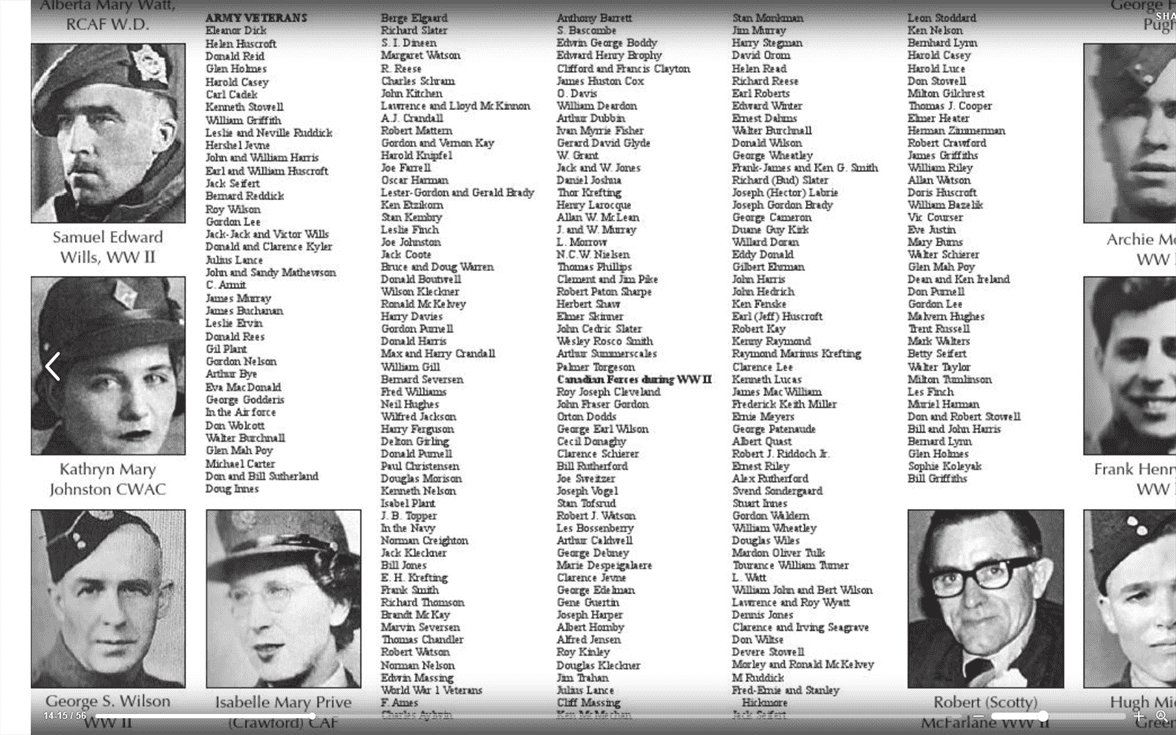 A memorial plaque was struck at a cost of 255.00 dollars which contains the names of Ponoka and area people who gave their lives in World War I. It was originally placed on the outside wall of the Elks Memorial Hall in August 1928, where it remained for over thirty years. After that time it was removed and when the Cenotaph was completed and the grounds landscaped in 1961 this plaque was placed near the Panoka Cenotaph where it remains at this present time.