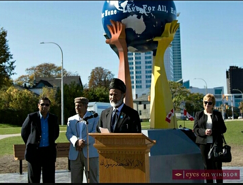 The sculpture, of four different coloured hands coming together together to hold a globe, was donated by Ahmadiyya Jana'at. The sculpture, which represents peace, unity and inclusion of all people celebrates 50 years of Ahmadiyya Jana'at in Canada in 2016. The sculpture was unveiled October 20, 2017.