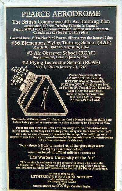 Erected in 1999 by the Lethbridge Historical Society, 783 Calgary Wing of the Royal Canadian Air Force Association, and Royal Canadian Legion Branch No. 4 (General Stewart), this plaque is dedicated to the memory of the Pearce Aerodrome, one of the sites of the British Commonwealth Air Training Plan during the Second World War. In addition to its inscription, the plaque bears the image of the layout of the aerodrome.