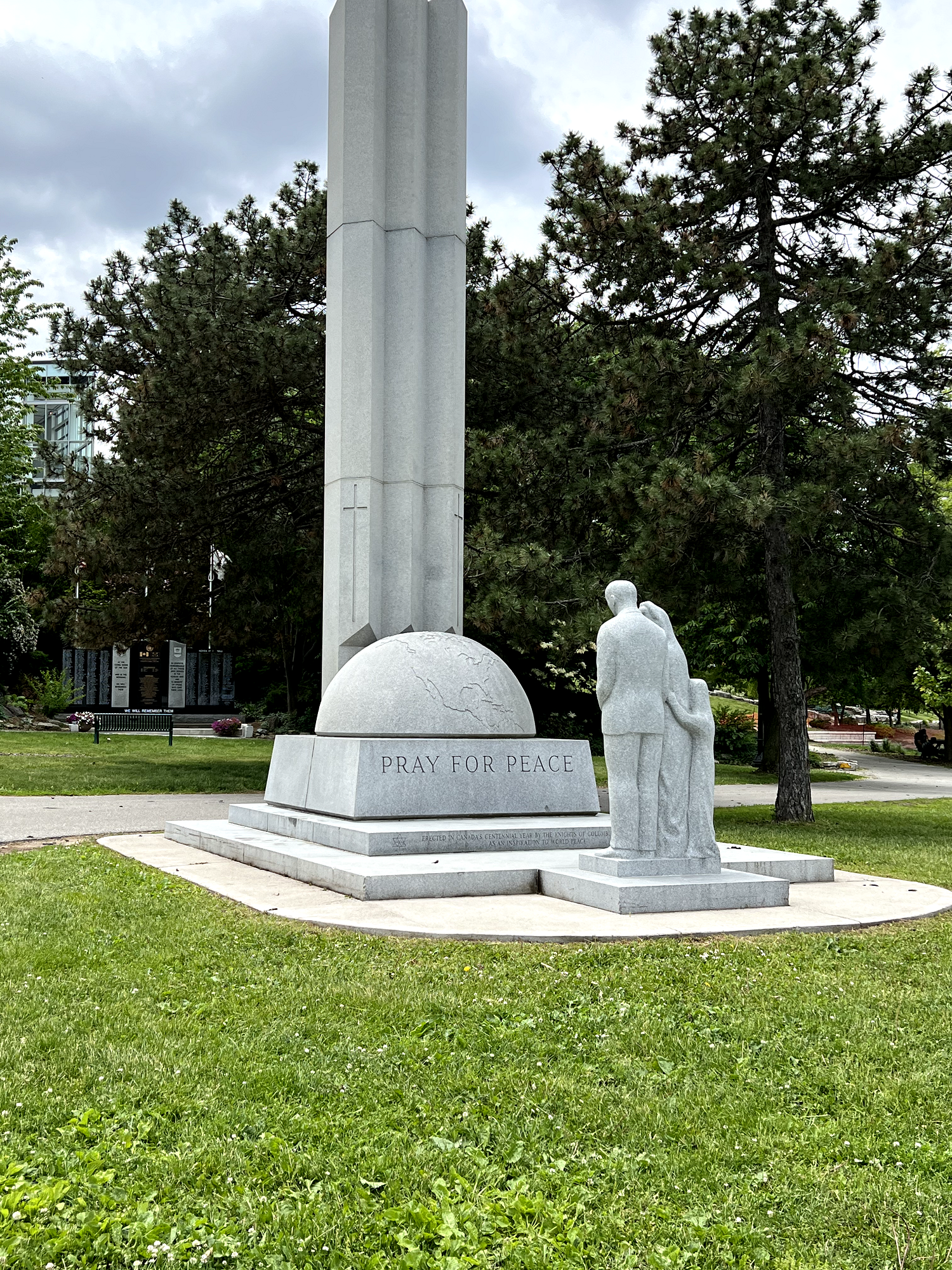 Pray for Peace was unveiled on October 22, 1967, by past State Deputy Louis Salini and dedicated by Most Rev. Wiliam J. Smith Bishop of Pembroke State Chaplain for the Knights of Columbus. The 25 feet high monument weighs 50 tons and was made in 13 sections of Barre granite. It was designed by Donald Ailles of Toronto and produced by the Smith Monument Company of Toronto. Statues of a father, mother and child face the columns and represent a family reading the inscription on the base of the columns.