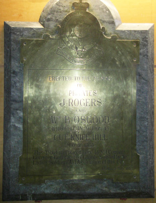 The Privates Rogers and Osgoode Tablet was erected by the No. 1 Company Governor Generals Foot Guards and the Ladies Soldiers Aid Association of Ottawa and unveiled on May 2, 1887.