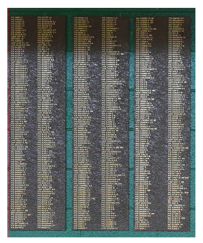 Twelve bronze panels list the names of 4,421 First World War fallen who served in The Queen’s Own Rifles of Canada or one of its perpetuated units: