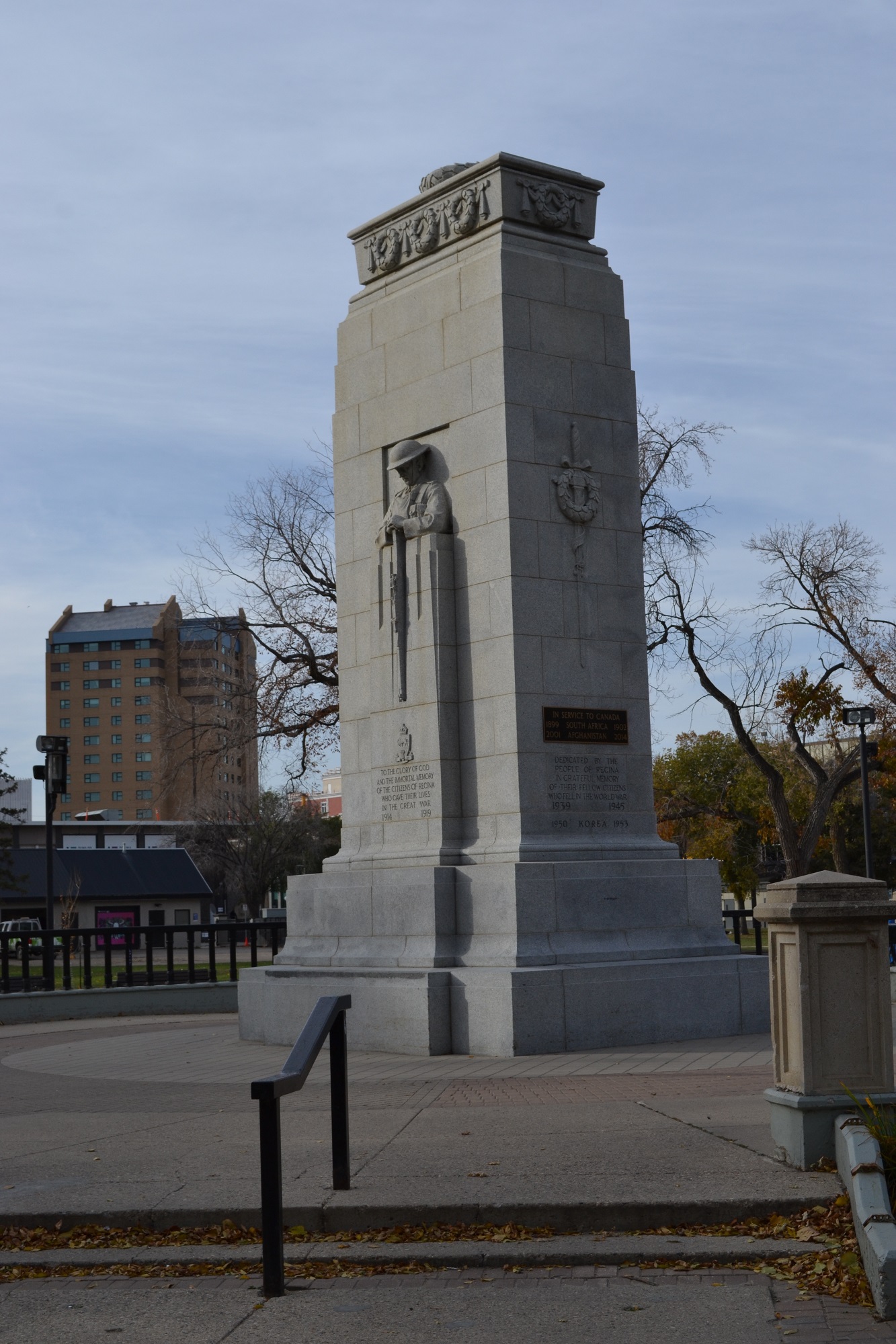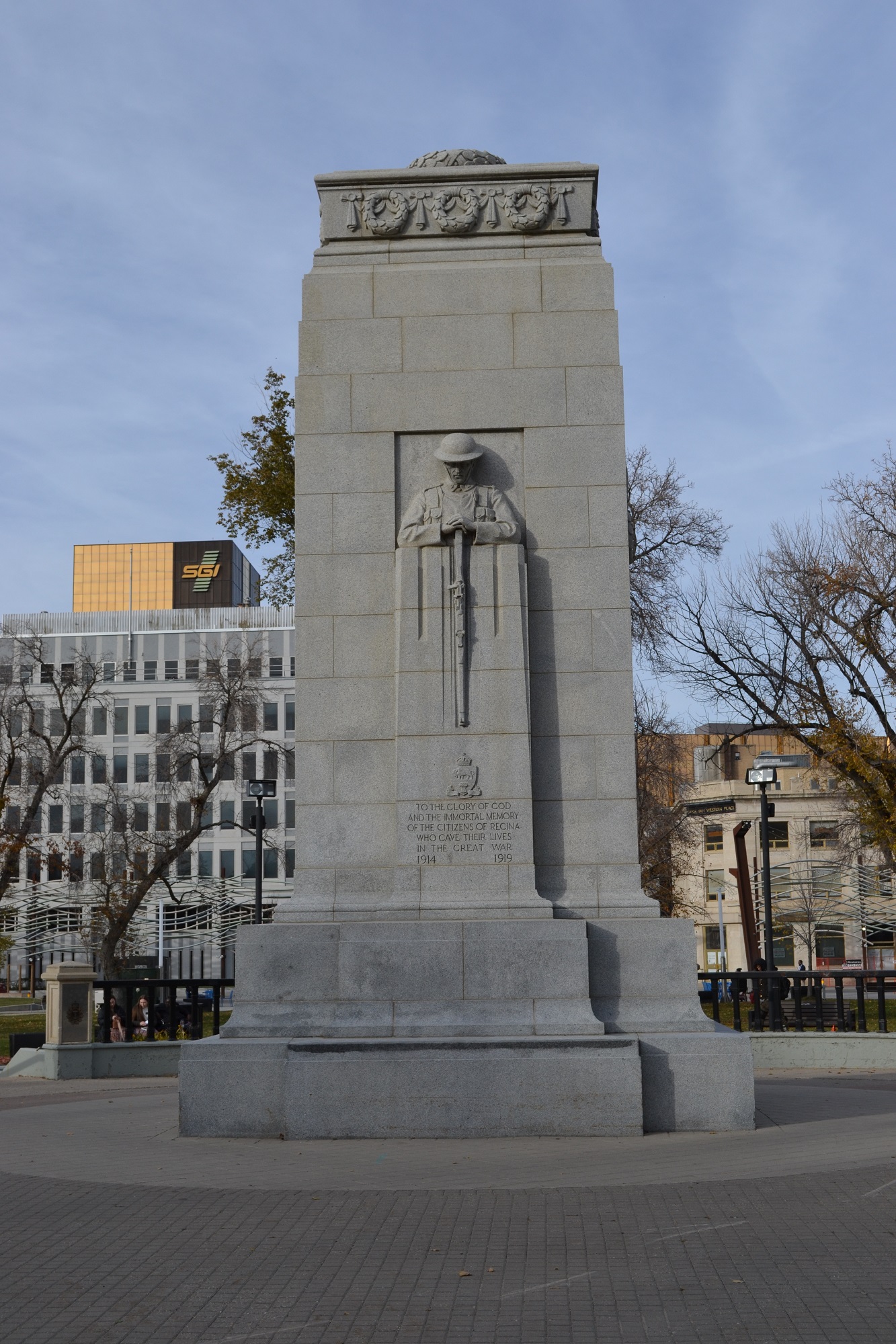Construction began in 1925 and the Cenotaph was unveiled on 11 November 1926. Local architect Francis Portnall was part of the design team. The design incorporates a carving of the "Brooding Soldier" by local architect Frederick Clemesha, who served with the 46th (South Saskatchewan) Battalion during the First World War. Clemesha's original version of this memorable figure can also be seen on the St. Julien Canadian Memorial in Belgium.