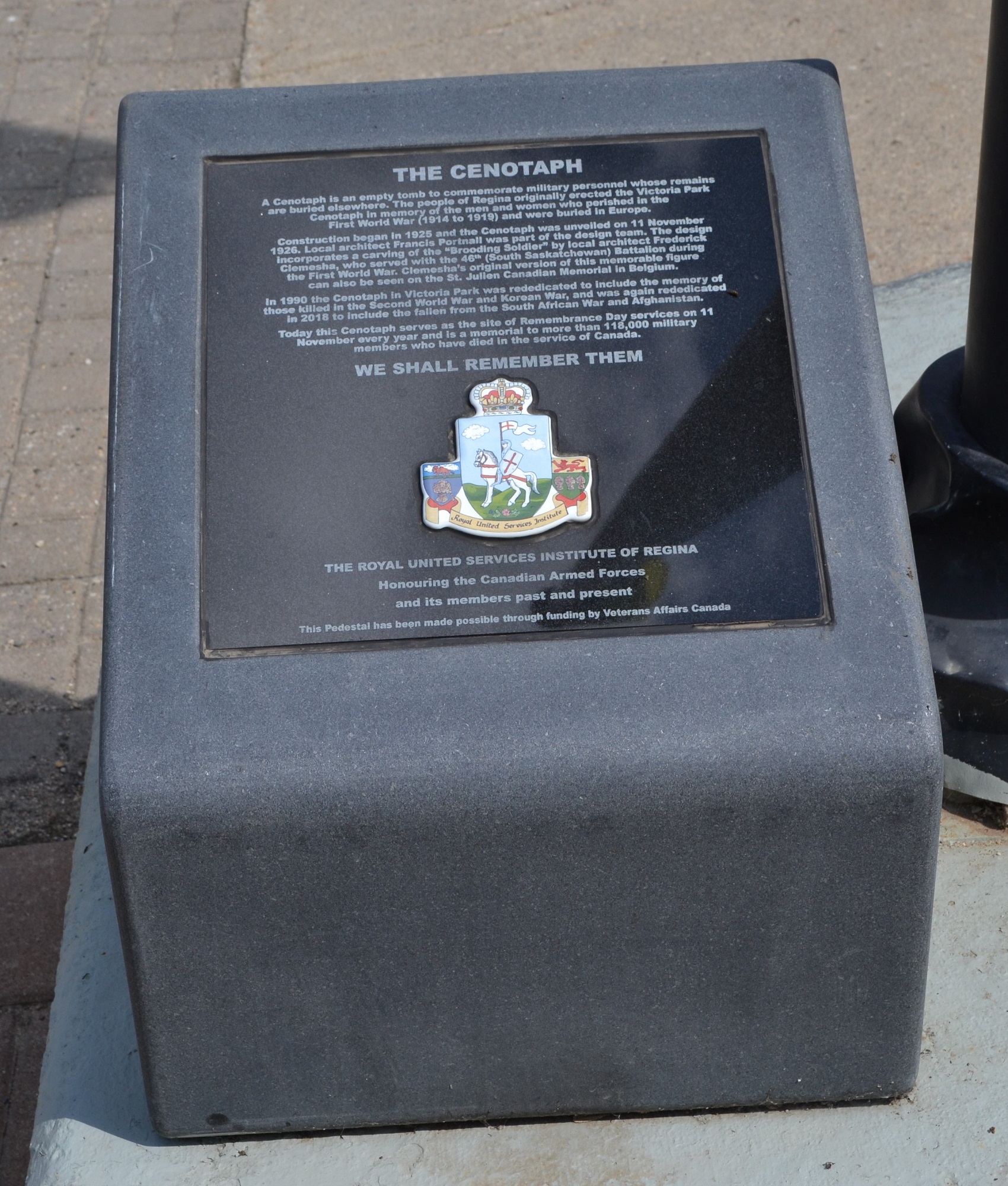 A Cenotaph is an empty tomb to commemorate military personnel whose remains are buried elsewhere. The people of Regina originally erected the Victoria Park Cenotaph in memory of the men and women who perished in the First World War (1914 to 1918) and were buried in Europe.