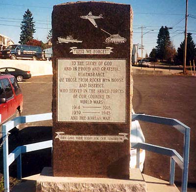 This memorial is dedicated to the veterans from Rocky Mountain House and District who served in the First and Second World Wars and the Korean War.