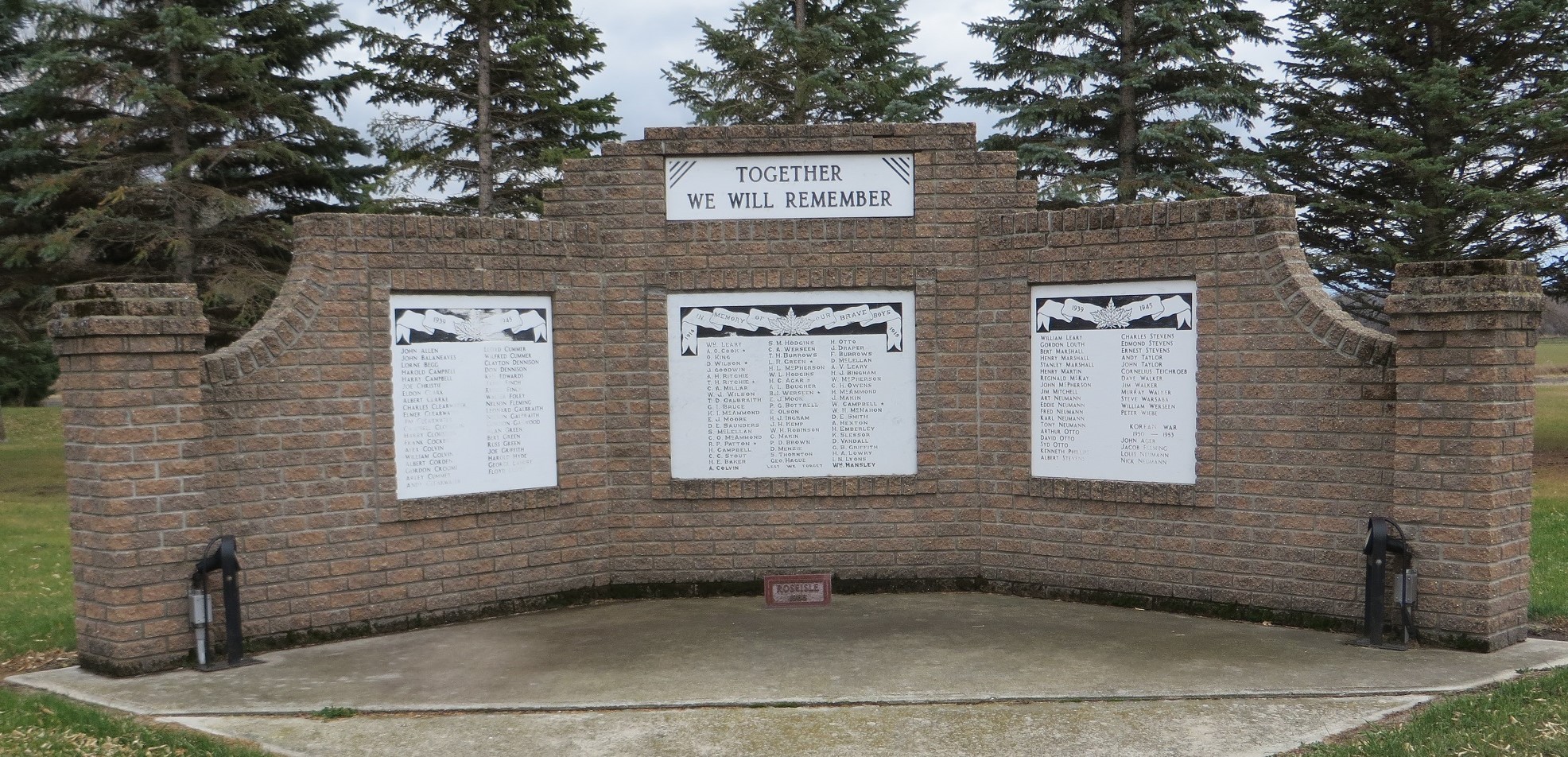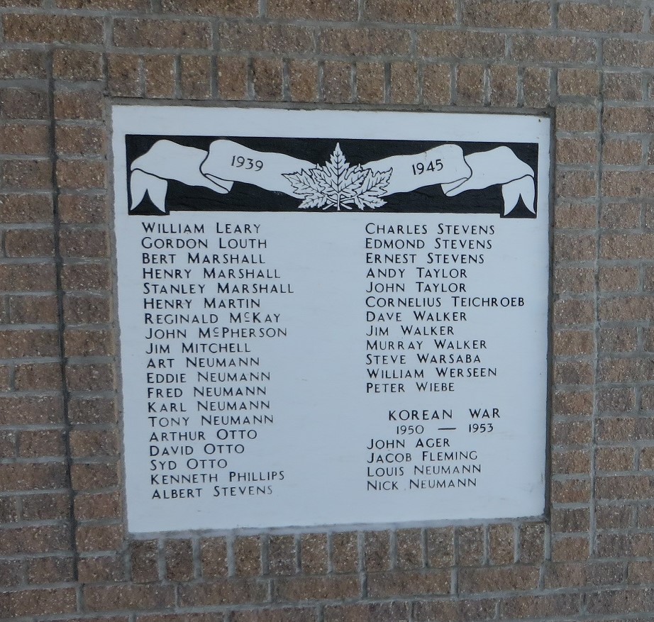 The Roseisle War Memorial commemorates soldiers from the local area who served in the First World War, Second World War, and Korean War. The hand-carved marble First World War plaque was originally erected in the Roseisle United Church in the Rural Municipality of Dufferin. The plaque was completed in 1915-1916 through a group of women called the Khaki Club. There were also two Second World War paper plaques in the church. When the church closed in January 1971, the plaques were placed in the Memorial Room in the Carman Memorial Hall. The Memorial Room was dedicated to servicemen killed in action. The plaques were then moved to the Carman Legion.