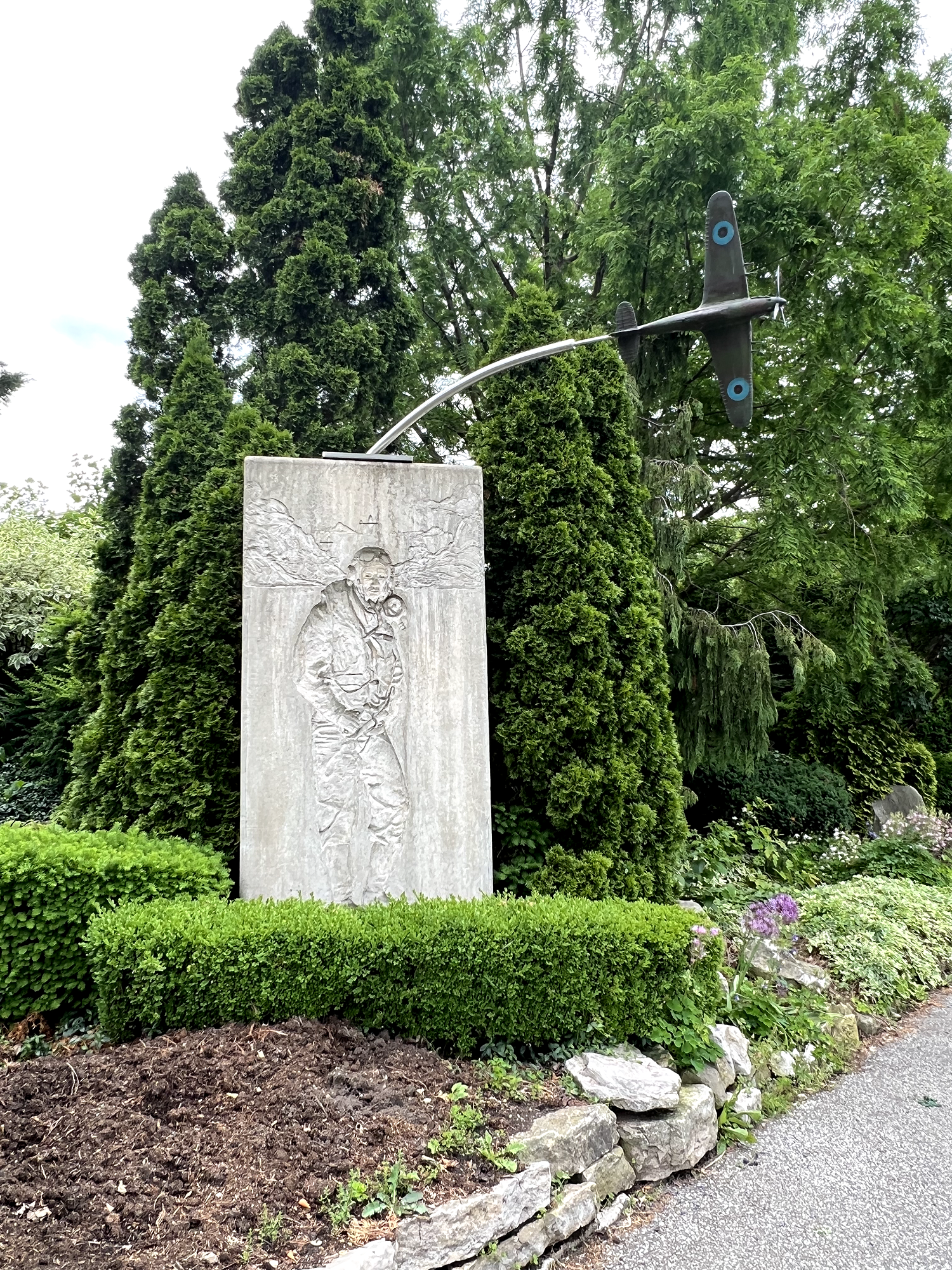 Behind the planes mounted into the cove and set within the gardens are the ghosted images representing the spirit of past pilots, two male and a female. The female is from the air transport auxiliary that transported newly constructed planes to Britain from Canada, one male is a Hurricane pilot and the other is a Spitfire pilot. Laura and Mark created a reverse relief to capture the essence of the past. They hand sculpted the pilots, then created the molds to be poured in cement.