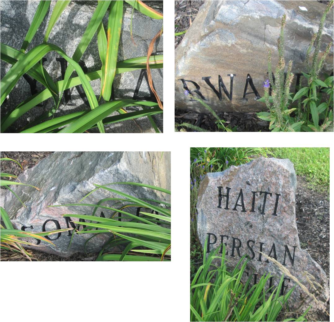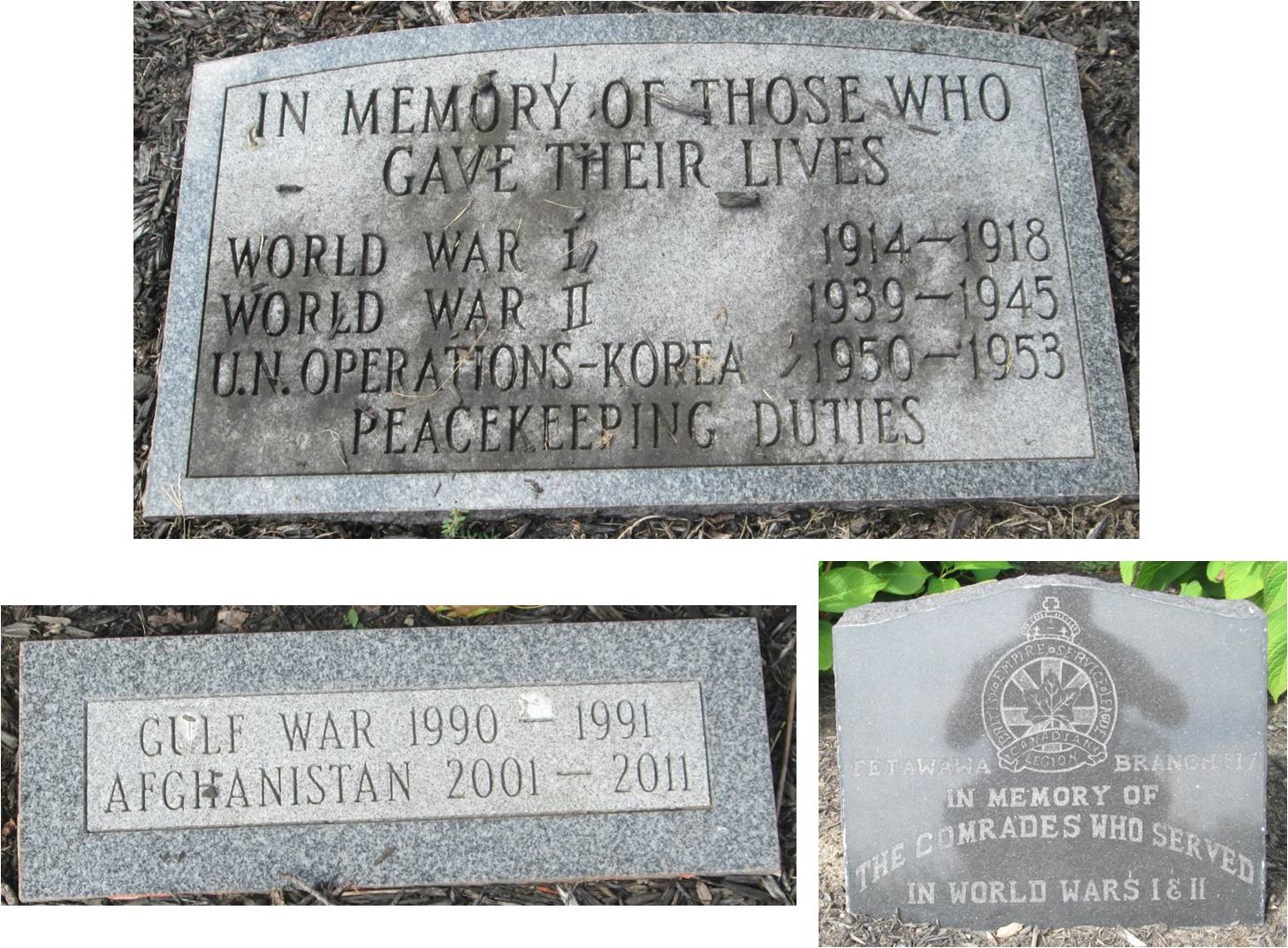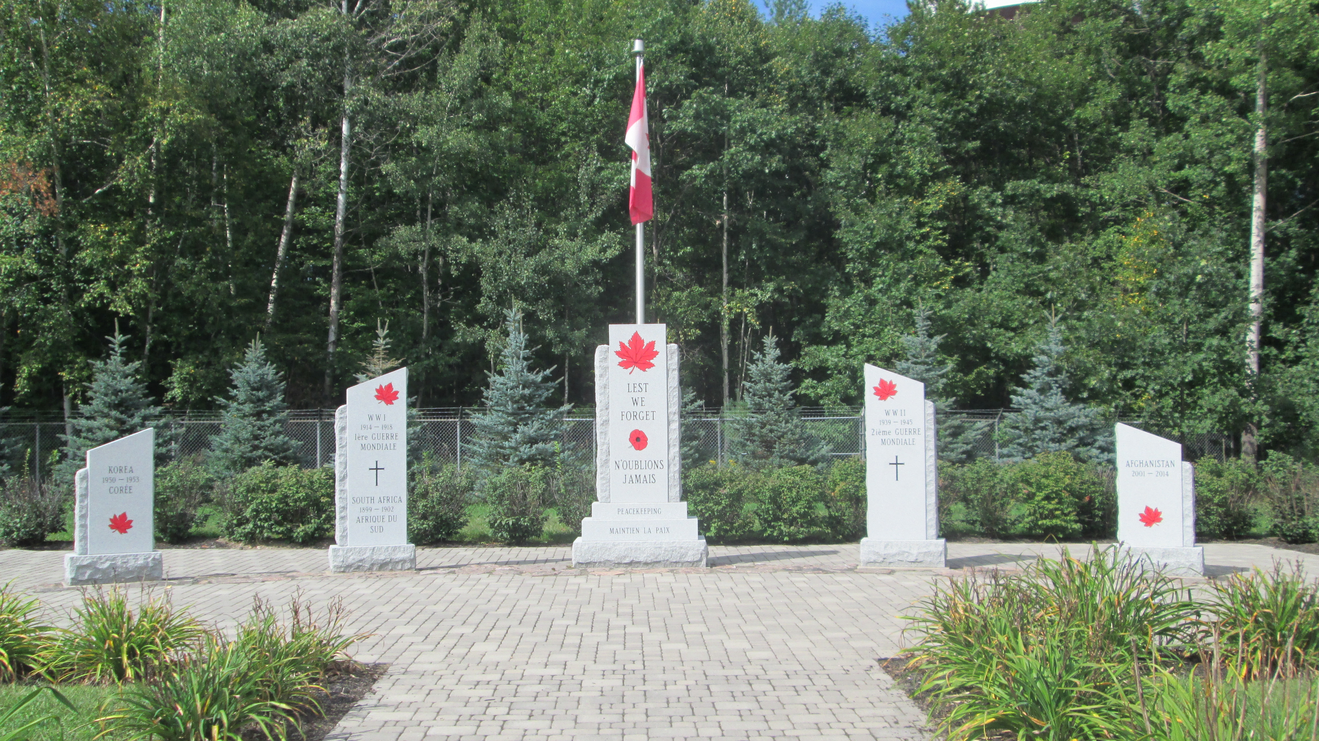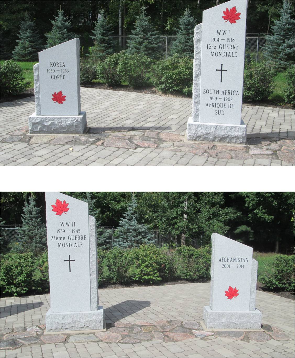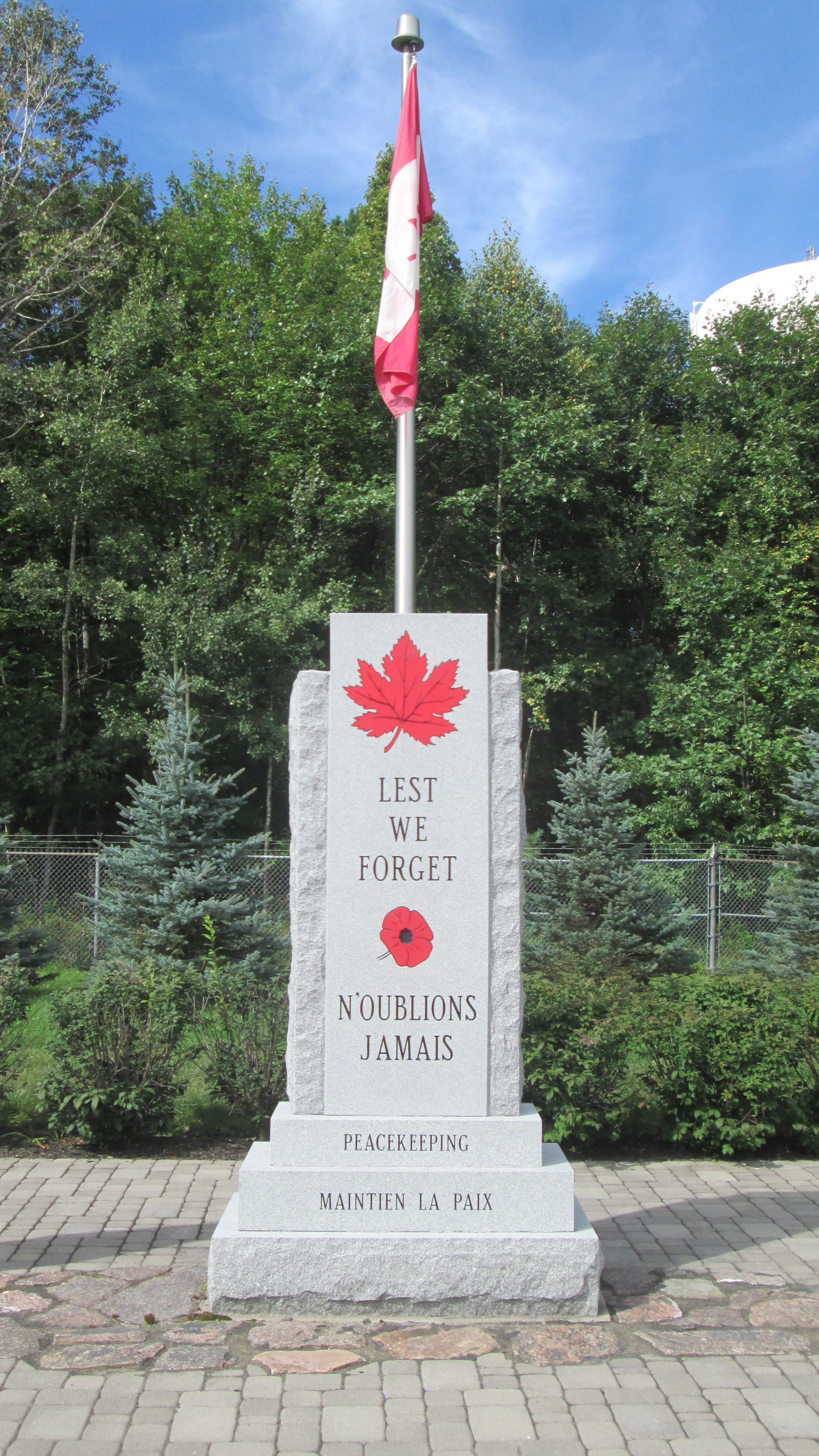 This memorial replaces a cairn-type memorial that had been erected by RCL Branch 517 and the Ladies Auxiliary. The new memorial comprises a number of elements: the primary element consists of five stelia inscribed with the names of the major conflicts involving Canadian troops. These stelia are surrounded by eight large stones on which are enscribed the names of other theatres of Canadian military operations. Finally, 3 granite tablets originating from the former memorial, have been included in the new memorial.