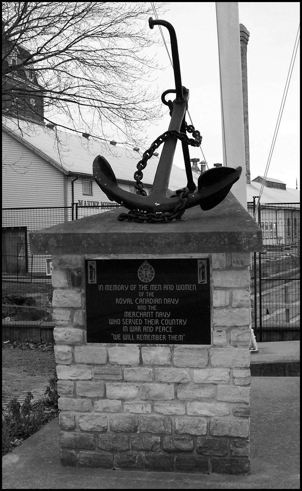 The Royal Canadian Navy and Merchant Navy Memorial is located at the foot of the Historic Kingston Dry Dock in Navy Memorial Park. The monument has an anchor on a stone base and two plaques. In the pathway are stones with the names of the Royal Canadian Navy ships built here during the Second World War.