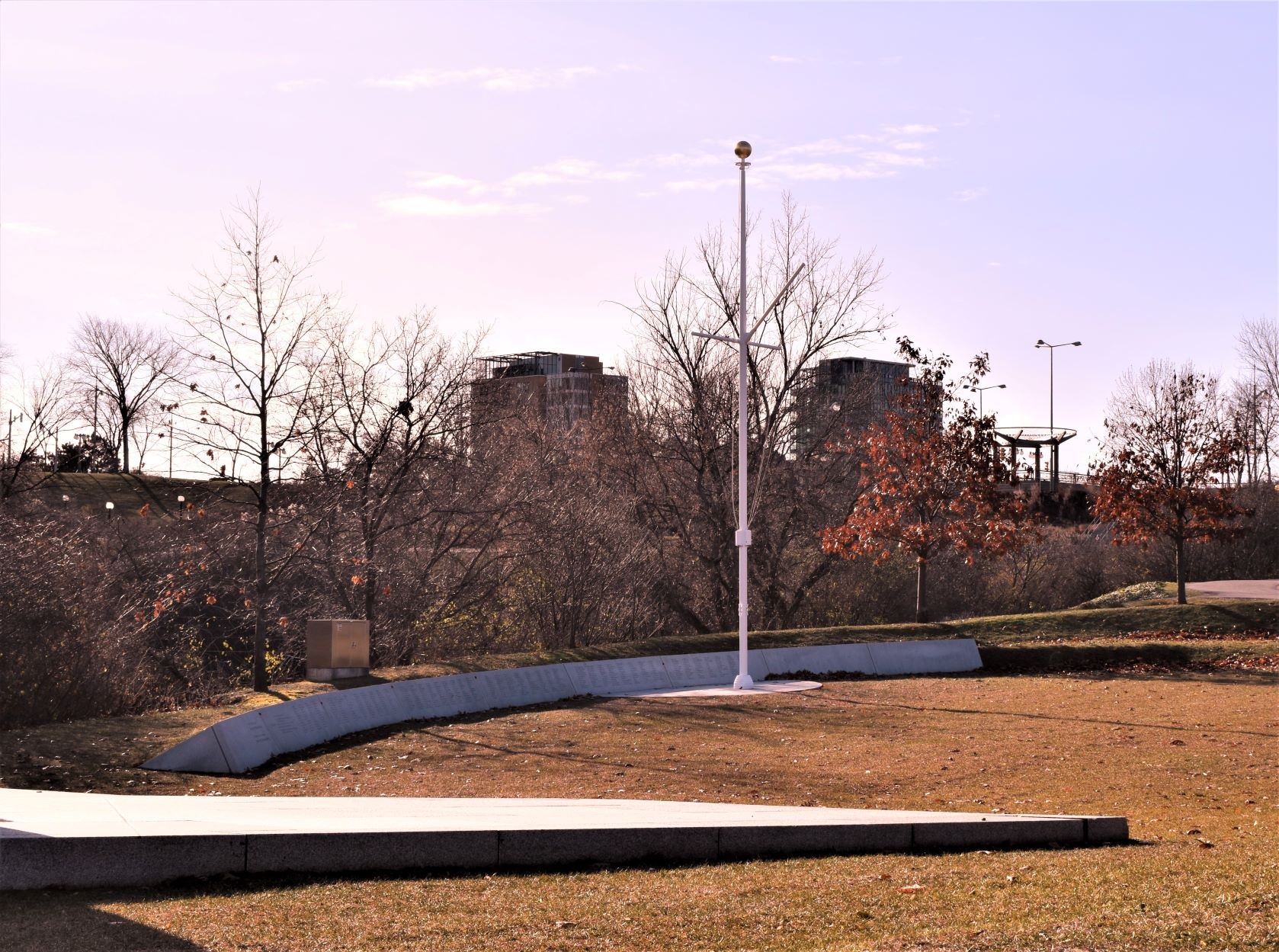 - Pier on the Ottawa River: a naval reference that makes the monument site symbolically accessible by water, though the pier could also be used for practical ceremonial purposes, for example to land dignitaries on the site from a vessel.