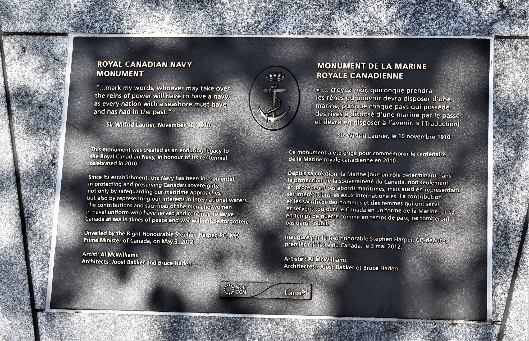 The Royal Canadian Navy Monument commemorates the contributions and sacrifices of the men and women in naval uniform who have served and continue to serve Canada at sea in times of peace and war. Built for the Navy’s Centennial in 2010, it is located at Richmond Landing, a quiet enclave in the heart of Ottawa, surrounded on three sides by water where it juts into the Ottawa River just below the Library and Archives Canada building and not far from the Canadian War Museum.