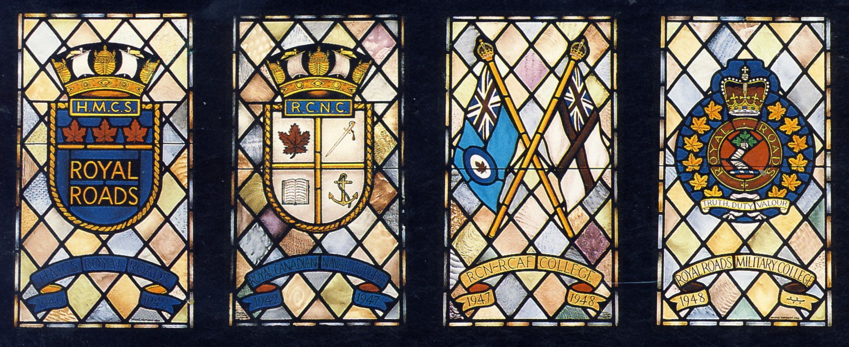 Memorials to the college include paverstones inscribed with the names of students and former staff, a stone listing each of the colleges, and stained glass windows. The first two windows were installed in October 1982 to mark the 40th anniversary of the re-establishment of the Royal Canadian Naval College and was donated by former students. Two more windows were later donated by the Royal Military Colleges Club to honour HMCS Royal Roads and Royal Roads Military College. In 1990, another two identical windows were added to mark the 50th anniversary, featuring the new college crest. Also in 1990, Prometheous and the Vulture, an abstract stone sculpture was created by Jay Unwin for the 50th anniversary of Royal Roads Military College.