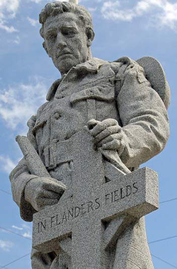 Emanuel Hahn's design represents the sorrows caused by war. The soldier atop the cenotaph looks down in sadness at the ground below him, as if he might find there, his fallen comrades, if not for the tragedy of war. The statue depicts a young, grieving Canadian soldier in First World War army uniform. With uncovered head, he is standing at a battlefield grave – a simple cross with poppies and a broken chain at the base and the flag draped behind it – the final resting place of a comrade killed in action. His left hand rests on the cross, while his right hand holds a reversed rifle. His helmet is slung over his shoulder.