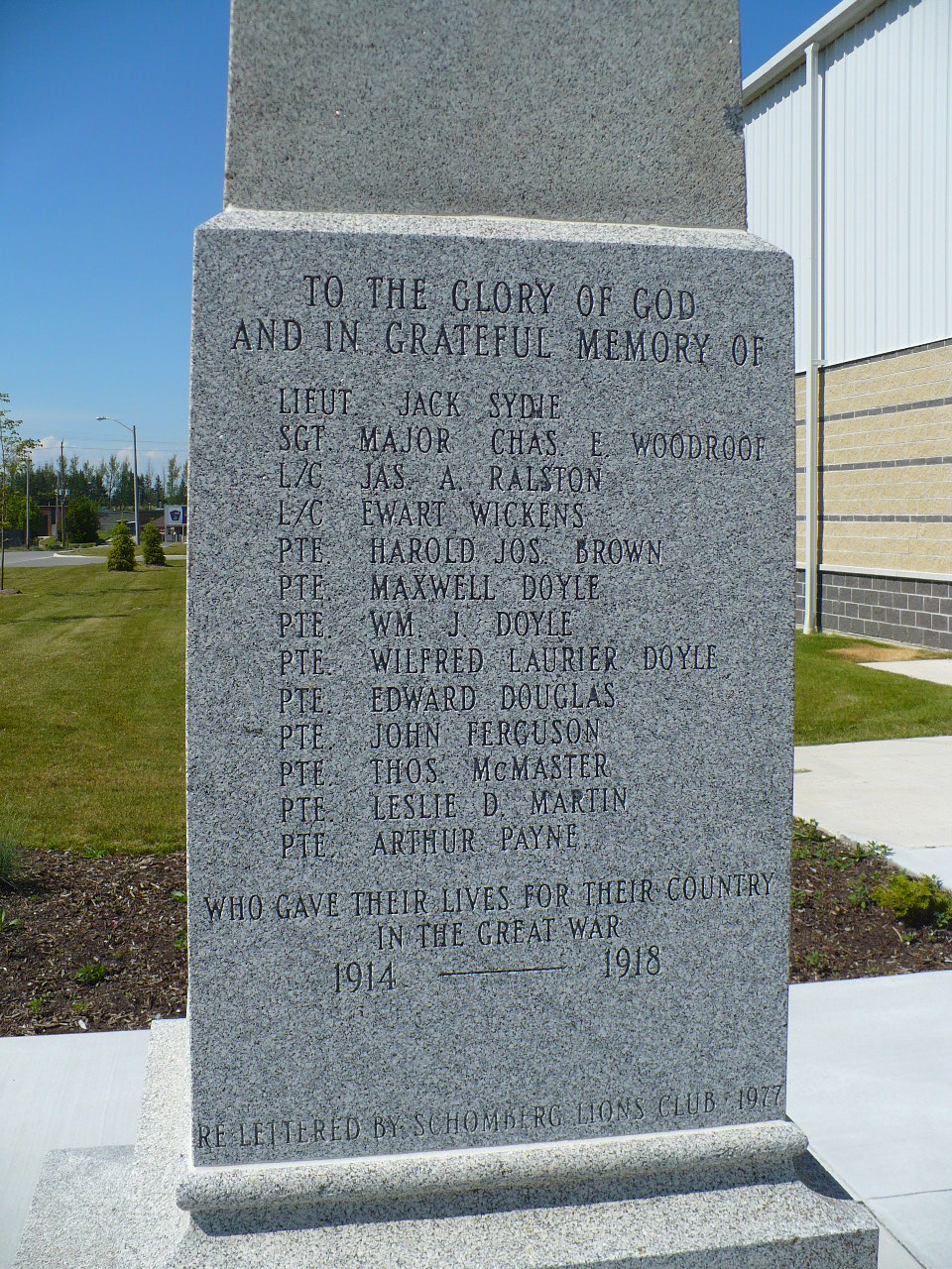 Dedicated to the men who lost their lives in the two World Wars, this memorial was originally located in front of the Schomberg Agricultural Arena, but moved to its current position beside the new Trisan Centre, in 2011. The Lions Club of Schomberg had the memorial re-lettered in 1977. Also featured is the logo of the 12th York Rangers, the local militia regiment which became part of the 127th Canadian Expeditionary Force in the Great War