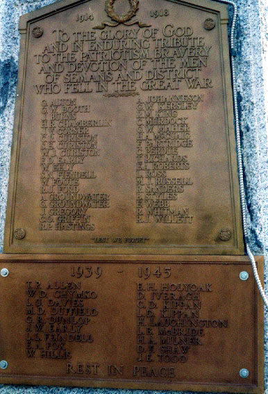 This memorial is dedicated to the men of Semans and District who died in the First and Second World Wars. It was constructed by stonemason Angus Mackay and unveiled and dedicated on September 18, 1927.