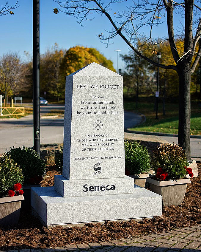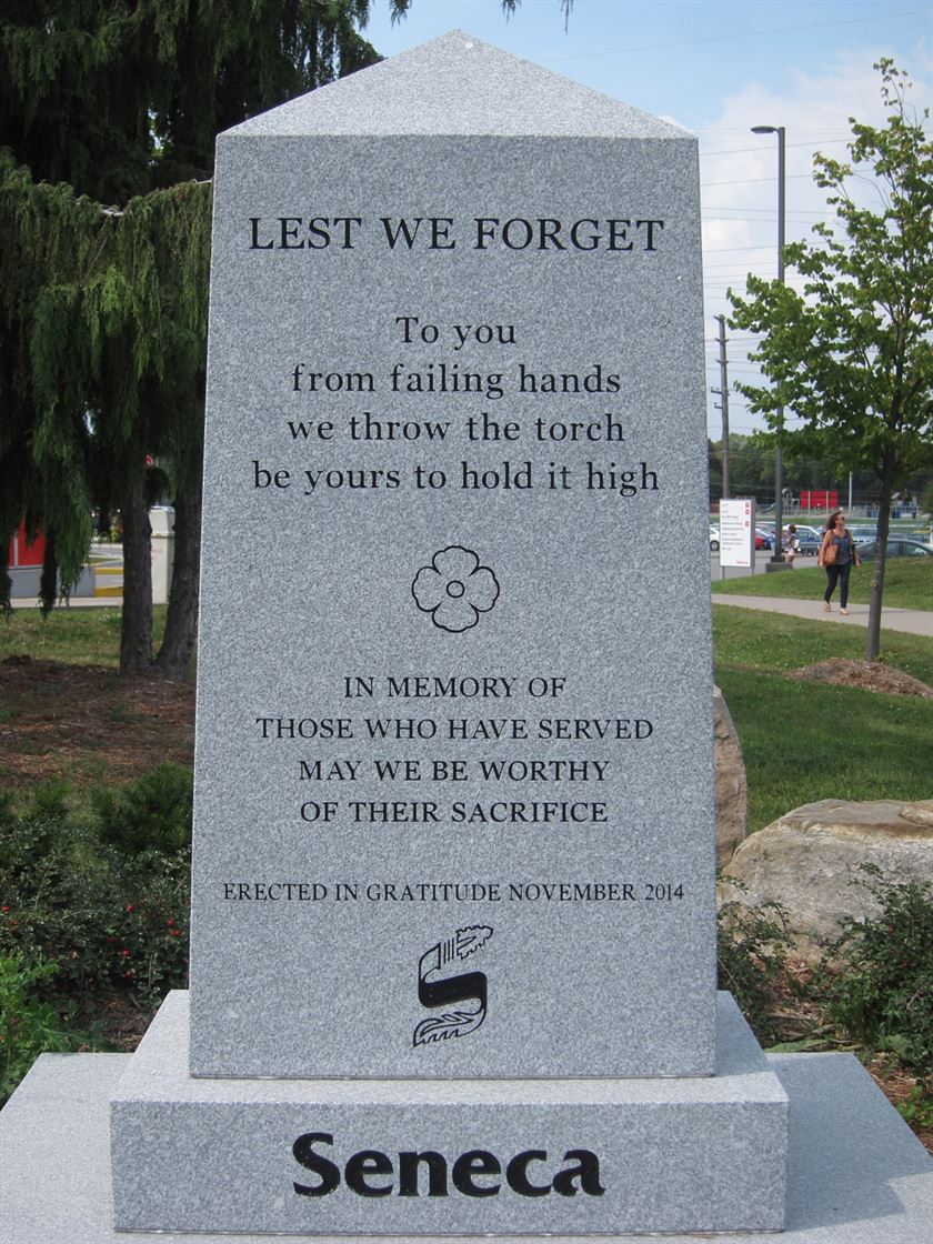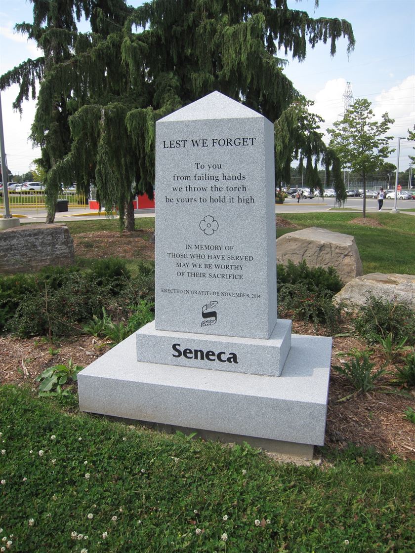 This memorial was unveiled Remembrance Day 2015 at Seneca College, Newnham campus in Toronto. The service included Second World War Veterans, students from the School of National Defence at Seneca, Military College personnel, Majors and Lieutenants and Indigenous peoples.