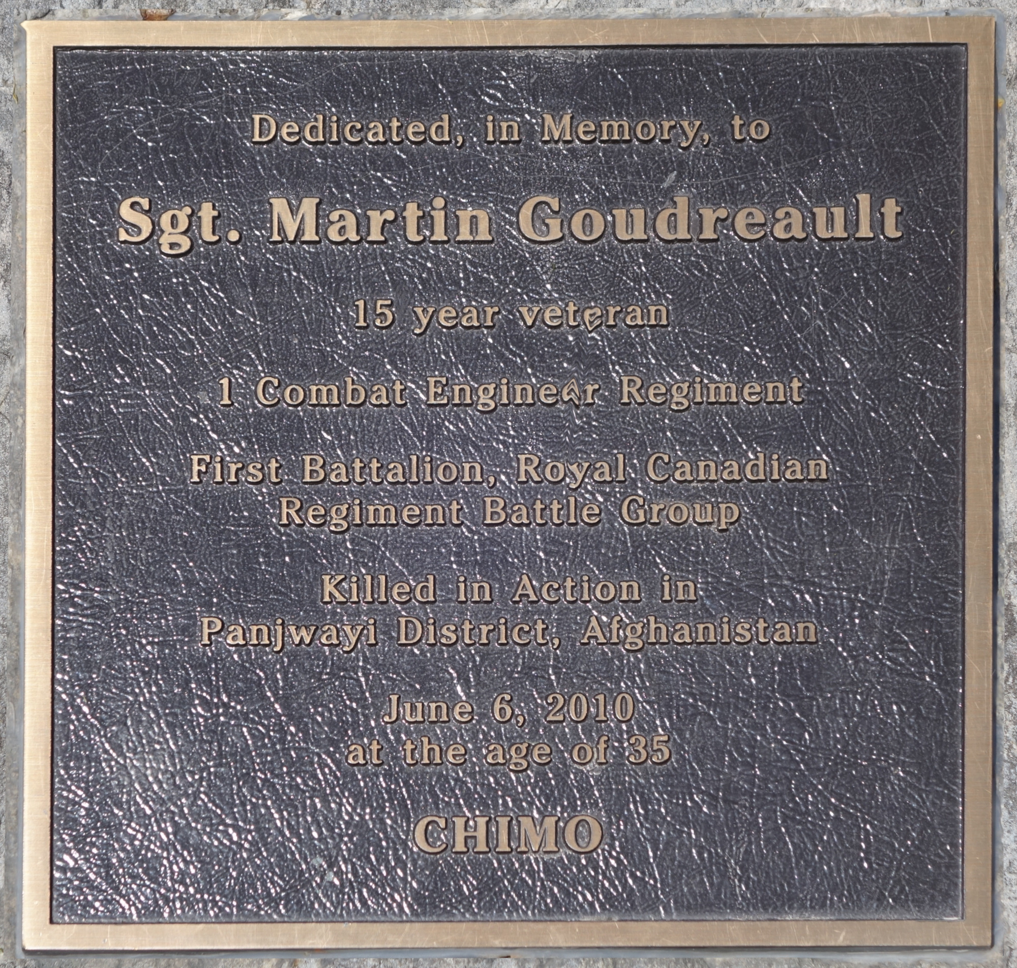 This park, is dedicated to the memory of Sergeant Martin Goudreault, member of 1 Combat Engineer Regiment and former resident of New Liskeard, who was killed in action in the Panjwayi District of Afghanistan on June 6, 2010.