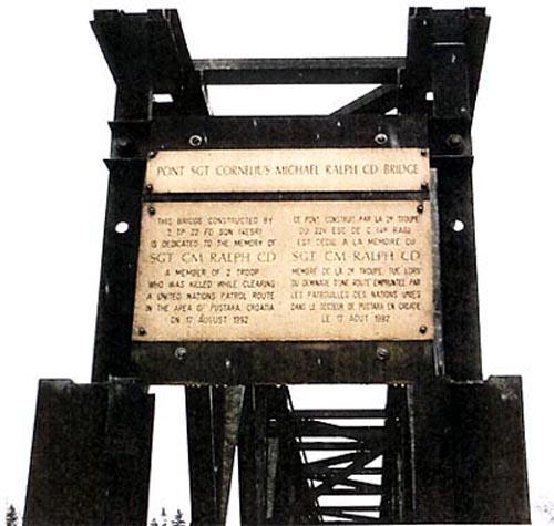 The Sgt. Ralph Bridge was constructed in memory of Sgt. Cornelius Michael Ralph who died serving in with Canadian Peacekeepers’ Operation Harmony in 1992 serving in Croatia.