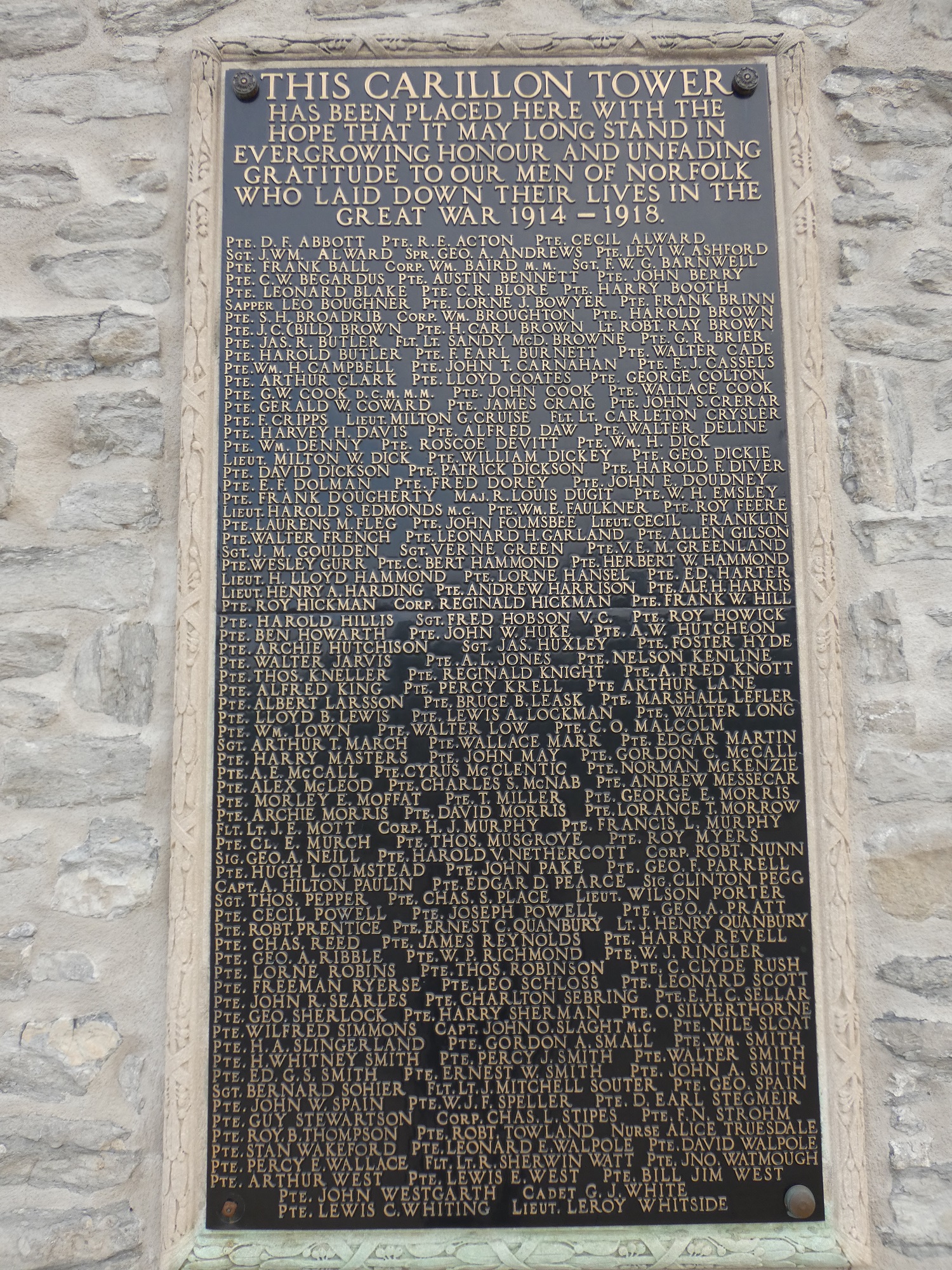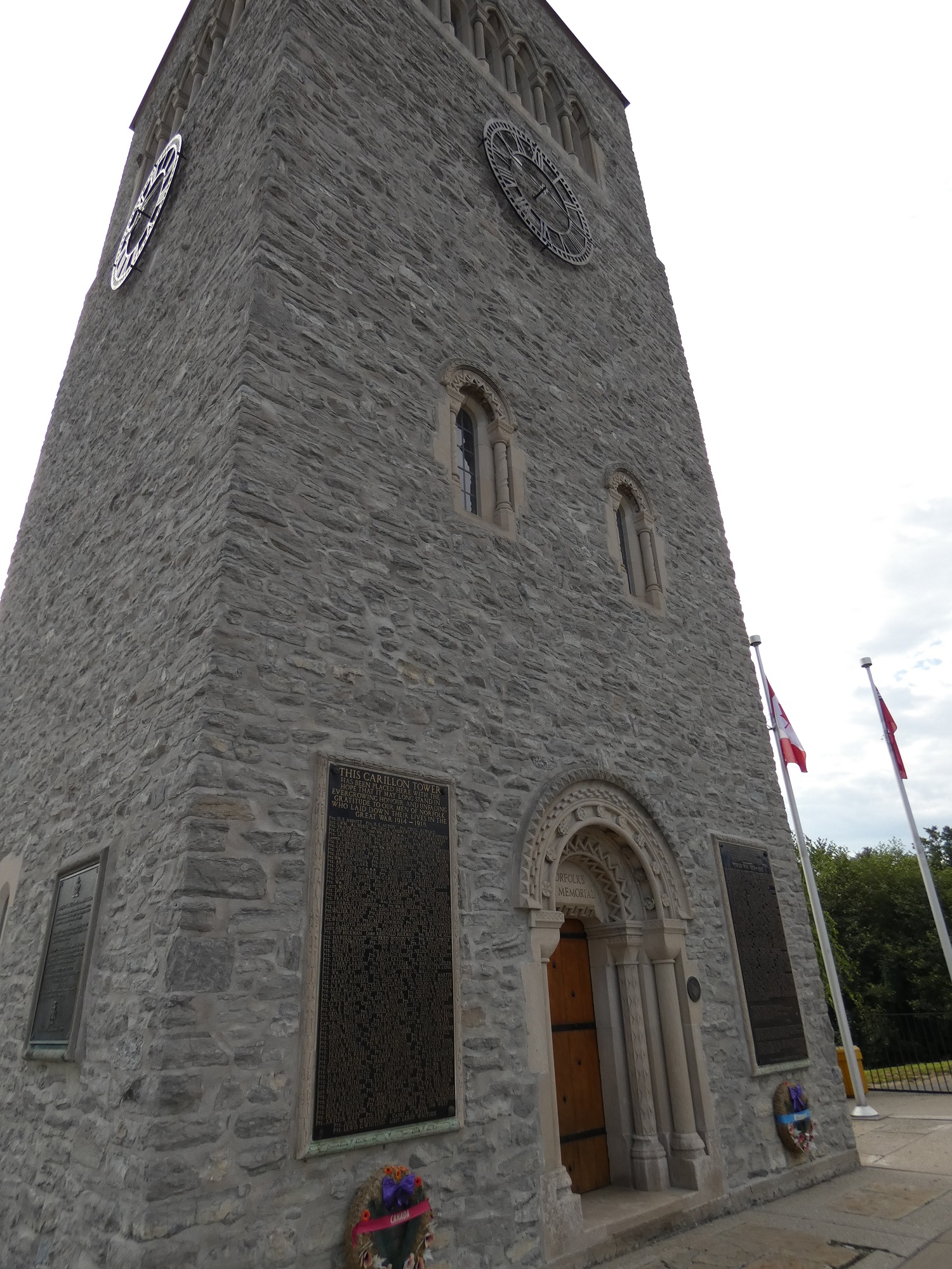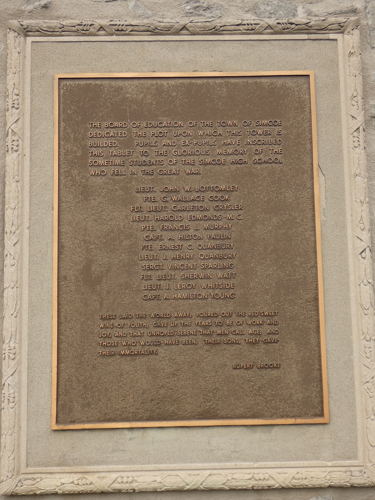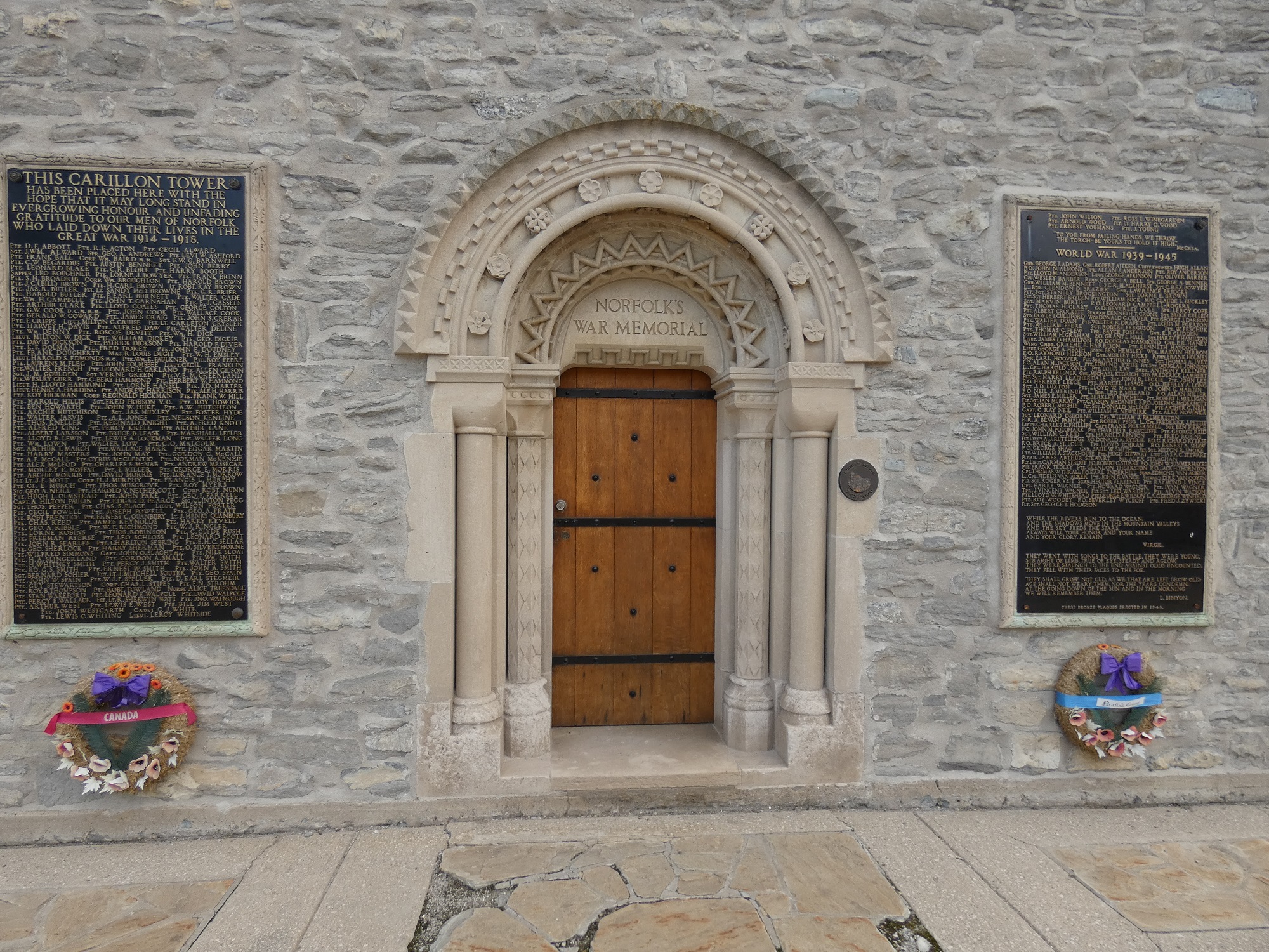 The Simcoe Carillon Tower is dedicated to Norfolk County residents who died in the First and Second World Wars. It was erected by the Committee of Prominent Veterans in 1925. Construction started November 4, 1924 and the dedication ceremony took place on June 17th, 1925. The structure is 60 feet in height and 22 feet square. It is constructed of Hagersville limestone and trimmed with carved Indianna stone and is set on a pile of foundation. It comprises 23 bells weighing over 8,000 pounds. In 1946, a plaque was added with the names of those killed in the Second World War. Excerpts from: The Carillon Tower Compiled by: Grade Six Enrichment Students of St. Joseph's School The Carillon Tower, in the stillness of the night, stands out as a guardian, watching over the Town of Simcoe. In the autumn of 1919 some of Simcoe's townspeople decided to do something about erecting a memorial in tribute to the soldiers who lost their lives in the war. Mr. George Werrett called a mass meeting in co-operation with the Great War Veteran's Association to consider a suitable memorial for Norfolk's war heroes who sacrificed their lives in the First World War. Sproatt and Rolph, famous architects from Toronto, were consulted, as well as Mr. Houseman, Managing Director from the Gillette & Johnston Bell Founding Company. Eventually the decision was made to construct a stone tower 60 feet in height that would contain a Carillon of 23 bells. The money for the construction was raised through a county-wide campaign. The tenders received were higher, by thousands of dollars, than the original estimates hoped for by the committee and the architects. The Board of Education offered to supply the site where the Memorial now stands. It was apparent that the town was banding together and that the additional funds would be raised. The Starting of the Construction: On November 4, 1924, a carload of smooth stone had arrived. The stone was to be used in the design on the entrance, the belfry and the window. Due to the fact it was located near the Lynn River, it had to be built on a series of piles. The monument is built as a solid block with design features being divided into four horizontal components. Differences occur in the lower half of the tower with the upper half being the same on all four elevations. The side facing onto Norfolk Street is the most impressive of the four sides. The doorway opening contains a thick, vertical, wooden plank door with a semi-circular stone transom inscribed with the words "Norfolk's War Memorial". Two commemorative bronze plaques on either side of the doorway honour the soldiers who died in the First and Second World Wars. There are ten paned leaded windows located in the tower. Above the window, in the upper half of the tower, is the bronze dial of the clock. In the upper section of the tower above the Norman arch motif of the doorway is a series of six semi-circular openings which allow the sound of the bells to travel away from the tower. The decorative stone labels are carved to form gothic arches. Again each of the openings is surrounded by colonettes. In the year 1925, Gillette & Johnston, Croydon, England were well established in bell founding. This influenced Simcoe townspeople's' decision to request Gillette & Johnston to cast the bells for the Carillon Tower. Gillette & Johnston's Managing Director, Mr. R.F.A. Houseman, met with the Norfolk War Memorial Committee to agree on a contract. Thousands of people attended the inspirational dedication ceremony on the wonderfully sunny afternoon of Wednesday, June 17, 1925. Never in Simcoe's history had there been a larger parade that marched downtown to the Tower. The Boy Scouts led the parade, with over 500 Great War Veterans beside them. Next marched a firing party, the 1st Norfolk Rifles Band, the 1st Battalion of Norfolk Rifles, under Lieutenant Colonel A.A. Winter, and pupils of Simcoe High and other Public Schools. The two Memorial plaques on the west side, containing the 217 names of Norfolk County men, who had been killed, were unveiled by Mrs. Abram West, of Houghton. She was a mother of three sons lost in the war. The other two Memorial plaques on the east side, containing 12 names of former Simcoe Composite School students were unveiled by Mrs. Christian Quanbury. Her two sons names were also included. The Re-Dedication: June 29th, 1975 marked the 50th Anniversary of the Carillon Tower. It was celebrated by a Re-Dedication Ceremony. Thousands of Simcoe residents attended. The Norfolk War Memorial is the second carillon installed in Canada (the first being at the Metropolitan United Church, Toronto) and the twelfth in North America. What is a carillon? A carillon is a set of bells that cover at least two octaves (23 bells) in chromatic series. They are perfectly tuned and pleasing harmonies may be produced by playing two or more bells together. The carillon is generally played from a clavier of keyboard. This consists of two rows of short handles or levers which are struck with the extended fist, and a row of foot pedals. The Carilloneurs: It has been through the efforts of dedicated and talented people that the residents of Simcoe have been able to enjoy Carillon concerts throughout the years. The carilloneurs throughout the time have been: Percival Price - 1924 Kamiel Lefevere - 1926 Henri Sohier - 1925 - 1943 assisted by Herman Dreher Herman Dreher 1943 - 1969 Angus MacLeod - 1969 - 1975 June Somerville - 1975 to present time Monica Graham - 1983 to present time