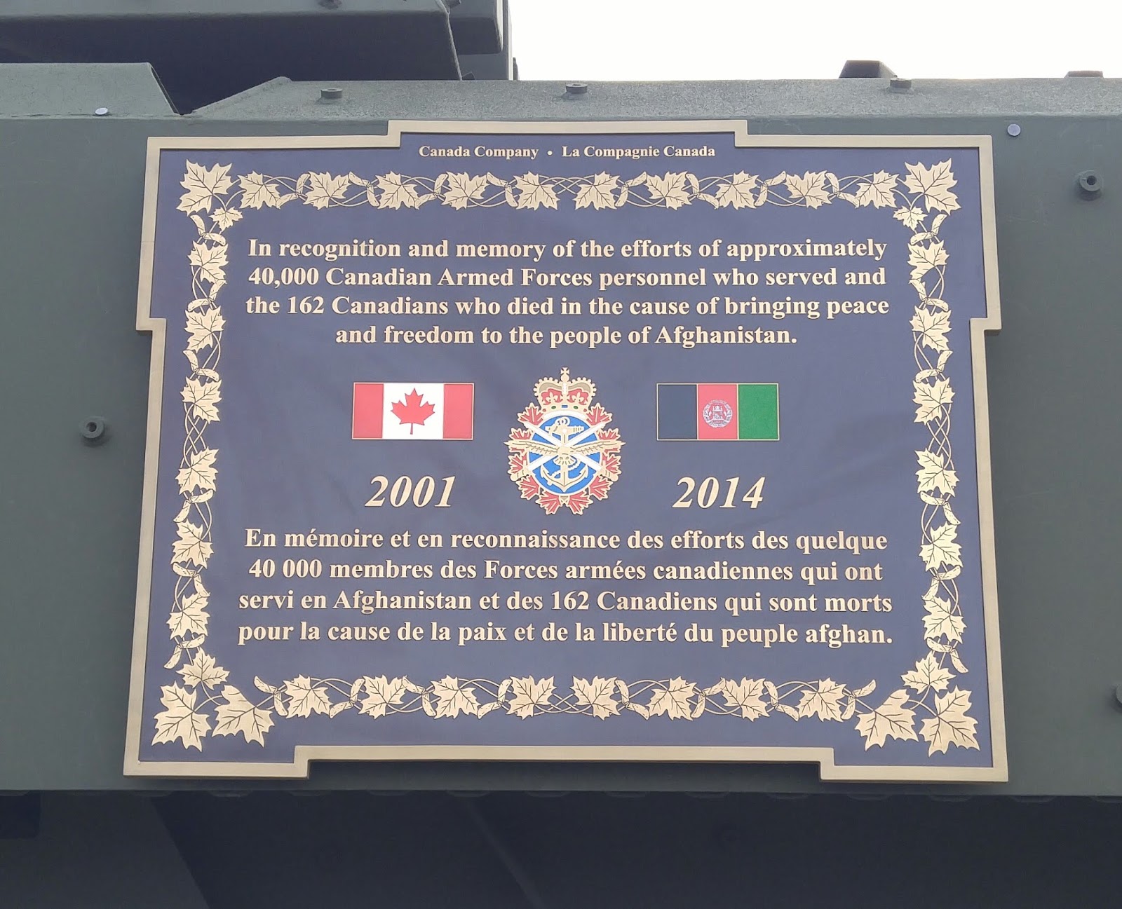 On November 5, 2014, the Canada Company Light Armoured Vehicle (LAV) lll Monument Program was launched to recognize the 40,000 Canadians Armed Forces who served in Afghanistan and to commemorate the 162 Canadians who lost their lives. The program closed after awarding 33 monuments to communities across Canada.
