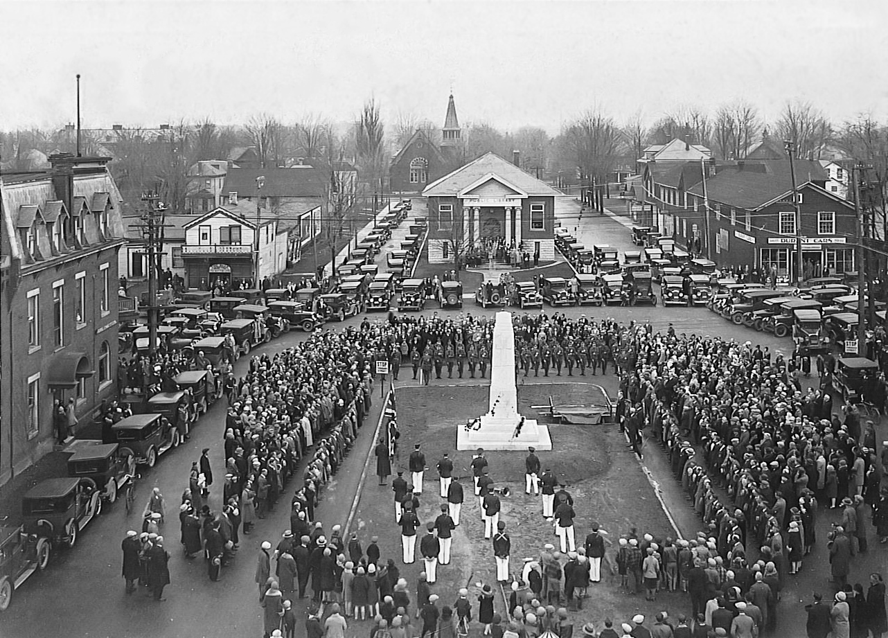 The Soldiers Memorial Monument in Tillsonburg, most commonly known as the cenotaph, was dedicated on Armistice Day, November 11, 1929. It was located in front of the Town Hall and was illuminated at night by the Public Utilities Commission. The memorial was unveiled one month before the end of Mayor Dr. R.E. Weston’s term and he called upon Mr. Theodore Young, whose son had been killed overseas, to unveil the monument representing the parents of the sons who gave their lives in the Great War.