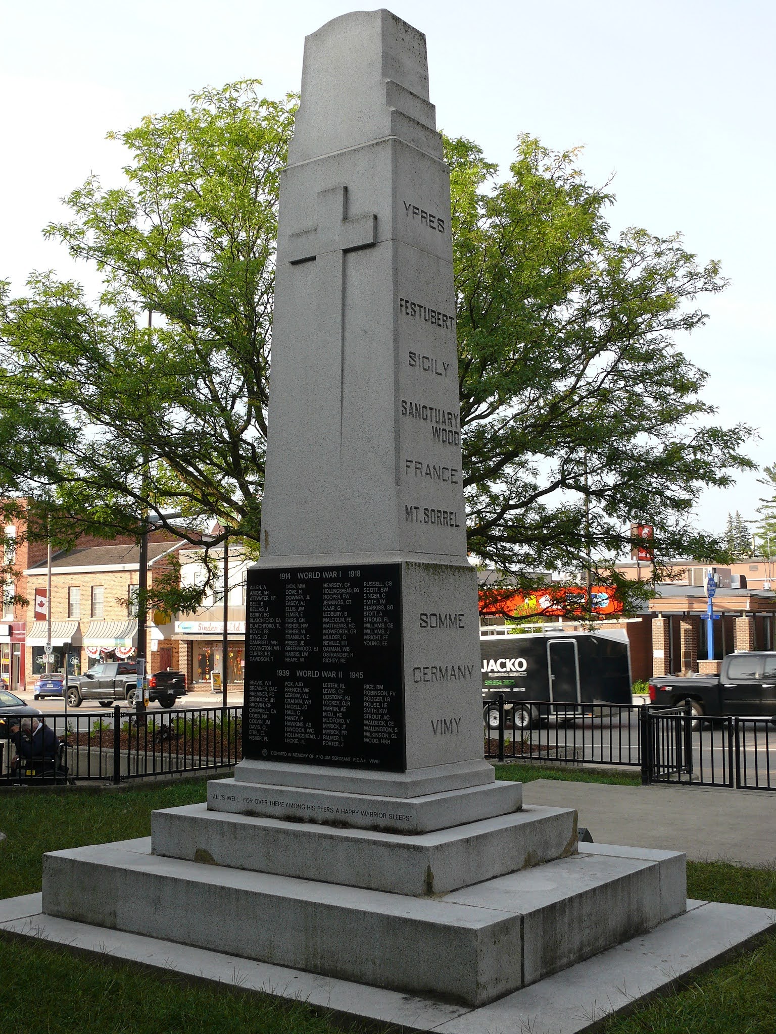 Similar to the Cenotaph in Whitehall, England, the Tillsonburg Soldiers’ Memorial Monument was designed and constructed by George Hunter of Simcoe. Made of grey granite from Beebe, Quebec, it stands 19 feet in height, with the names of the battles in which the men of Tillsonburg fought engraved on it.