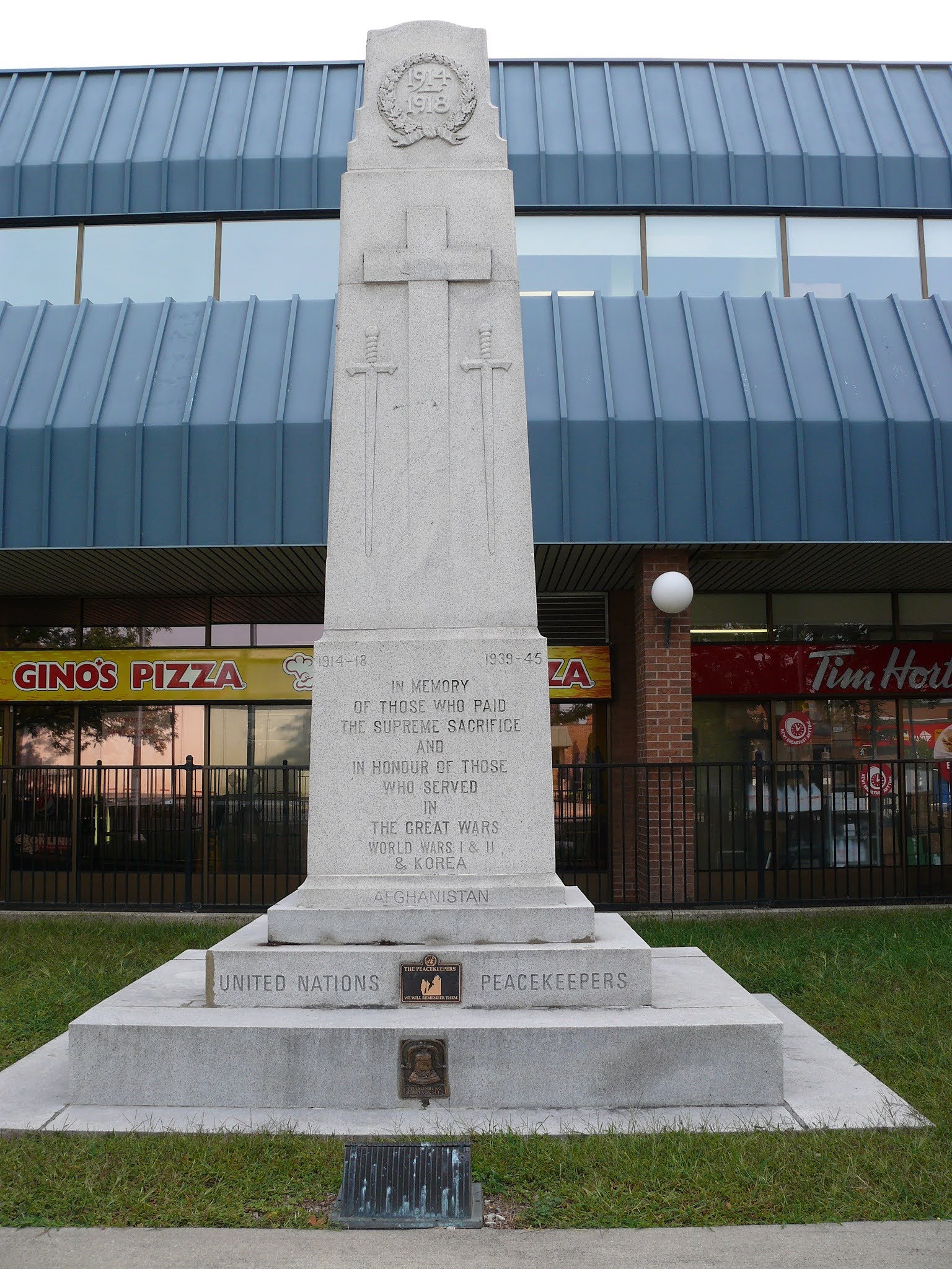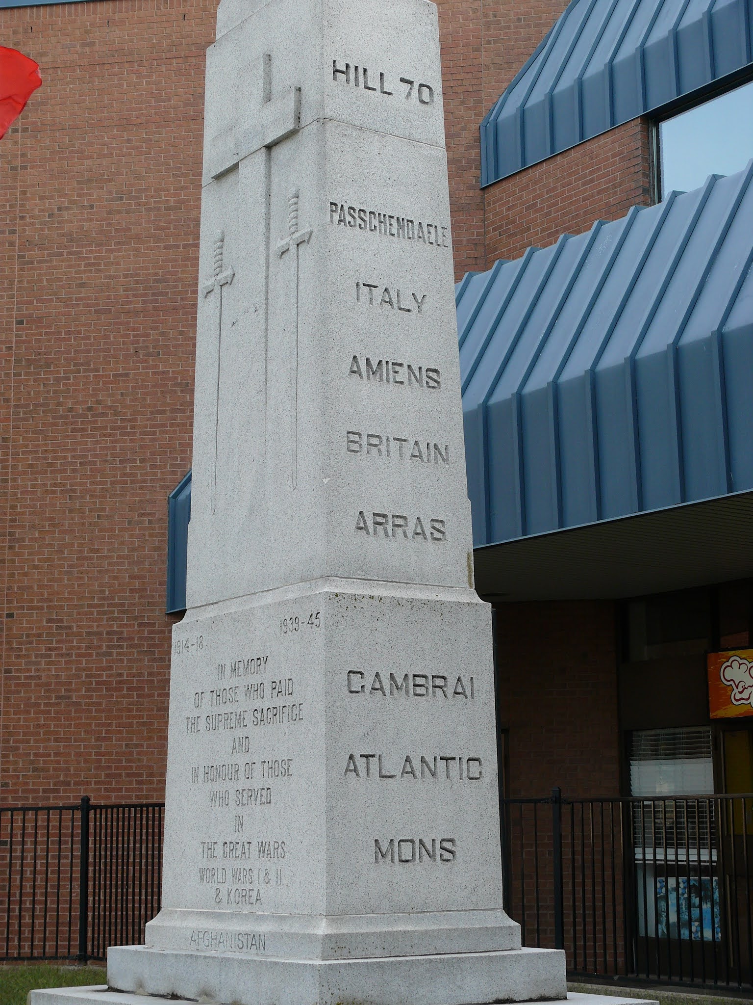The memorial was eventually moved in front of the Tillsonburg Town Centre, which opened in 1980. On October 7, 2014, a special dedication ceremony organized by the Royal Canadian Legion Branch 153 Tillsonburg Varnavair and the Tillsonburg Military History Club was held at the cenotaph to honour members of the International Security Force who served in Afghanistan. Sergeant Stephen Thomas MB, a member of the Queen’s Own Rifles, officially unveiled the Afghanistan memorial marker engraved on the cenotaph. Retired Master Corporal Kevin DeClark laid a memorial wreath bearing 158 poppies in honour of the 158 Canadian soldiers and civilians who had given their lives in Afghanistan.