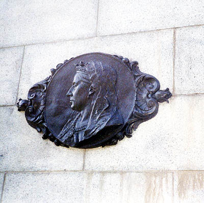 On the left side is a bronze plate with King Edward VII's profile and on the right side is a bronze plate with a profile of Queen Victoria. The memorial was completed in 1914. It was the last major piece of artwork Louis-Phippe Hebert completed and the only equestrian statue he ever made.