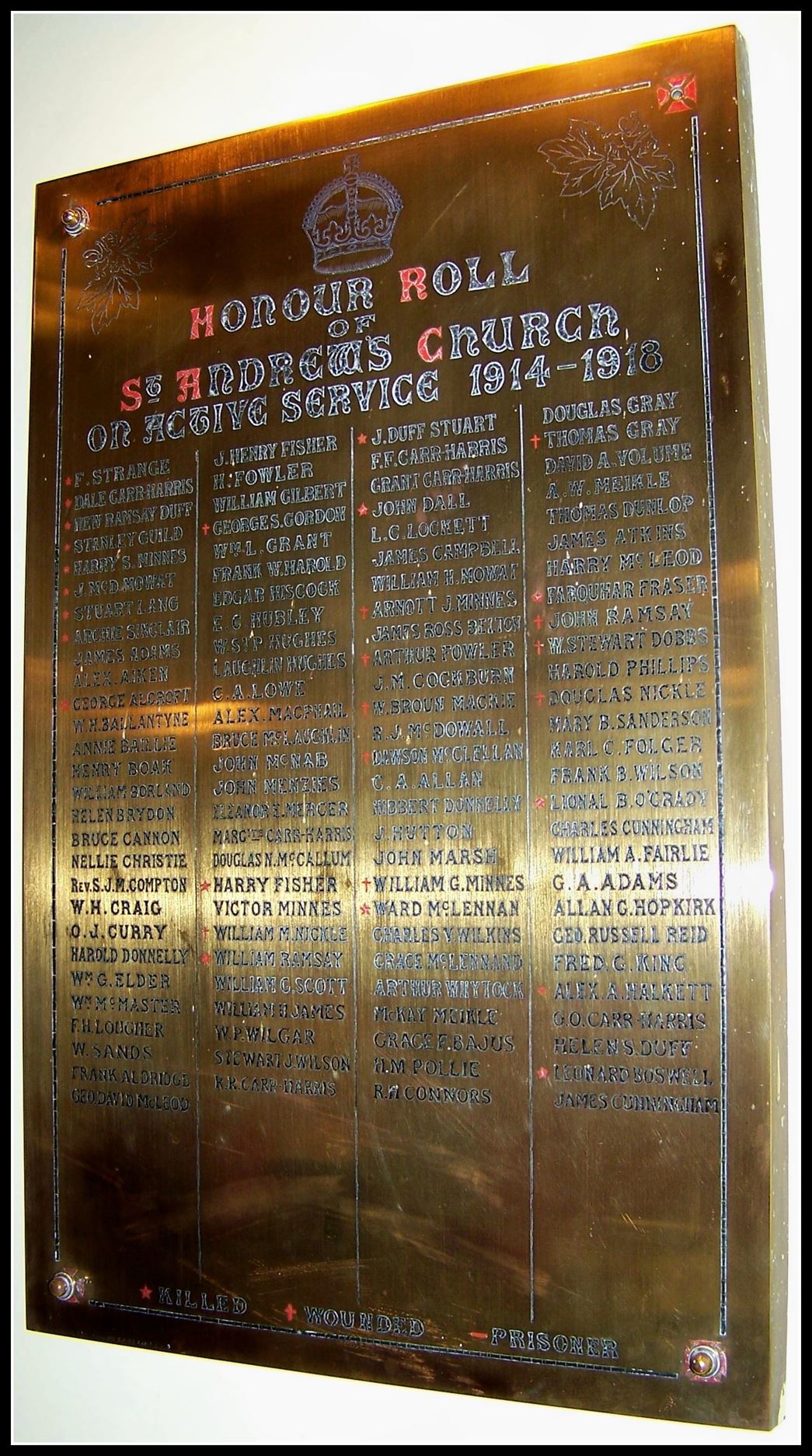 First World War Honour Roll: 1914-1919 In memory of the men of St. Andrew's Church who fell in the Great War and in honour of those who served overseas.