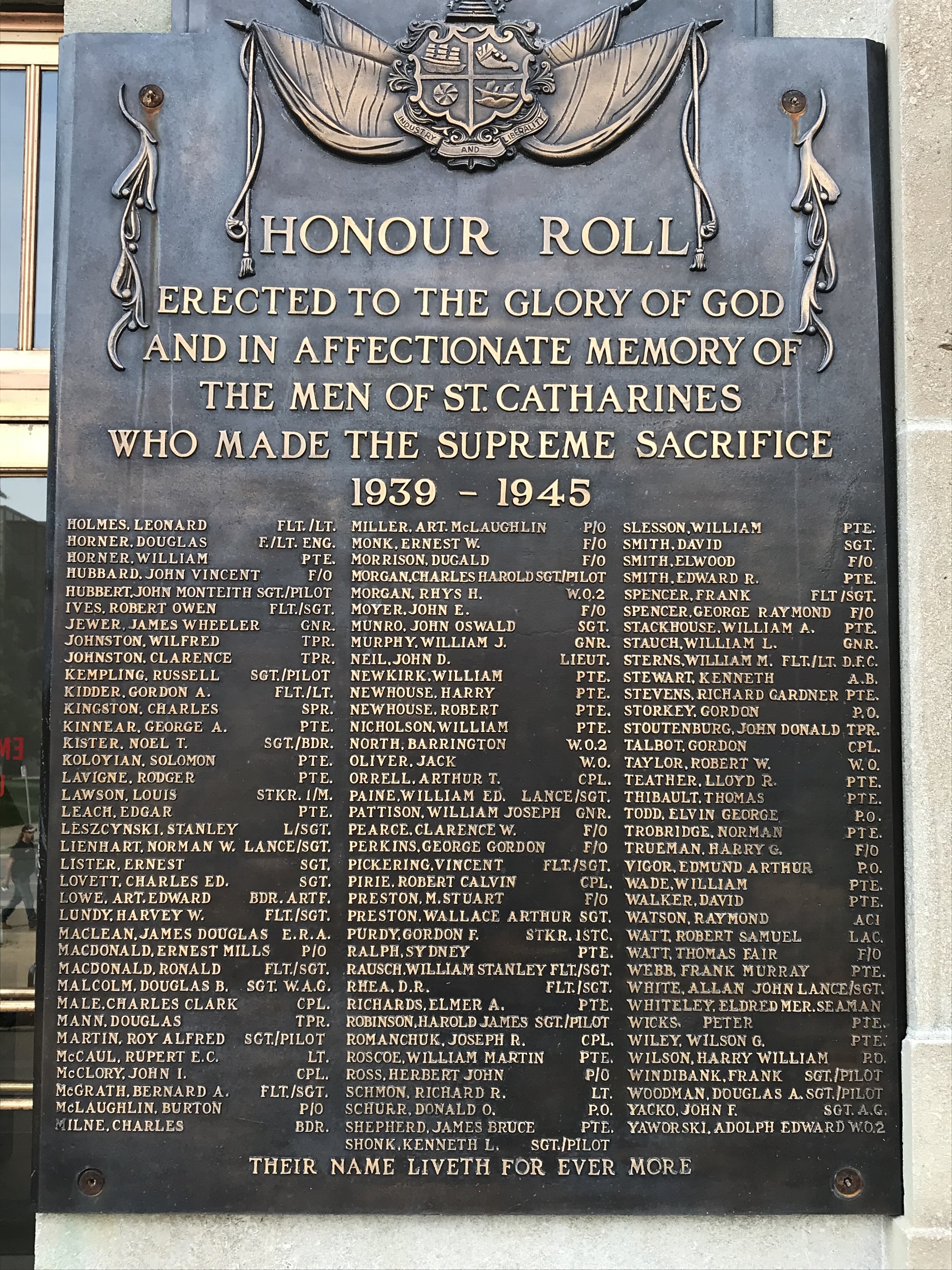 This memorial is dedicated to the citizens of St. Catharines killed in the Second World War. It was erected by the City of St. Catharines.