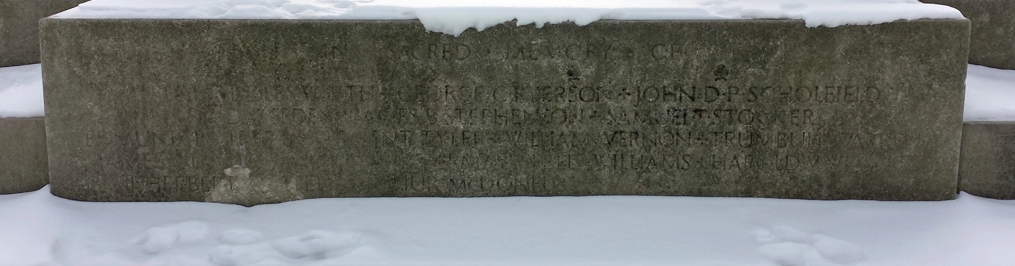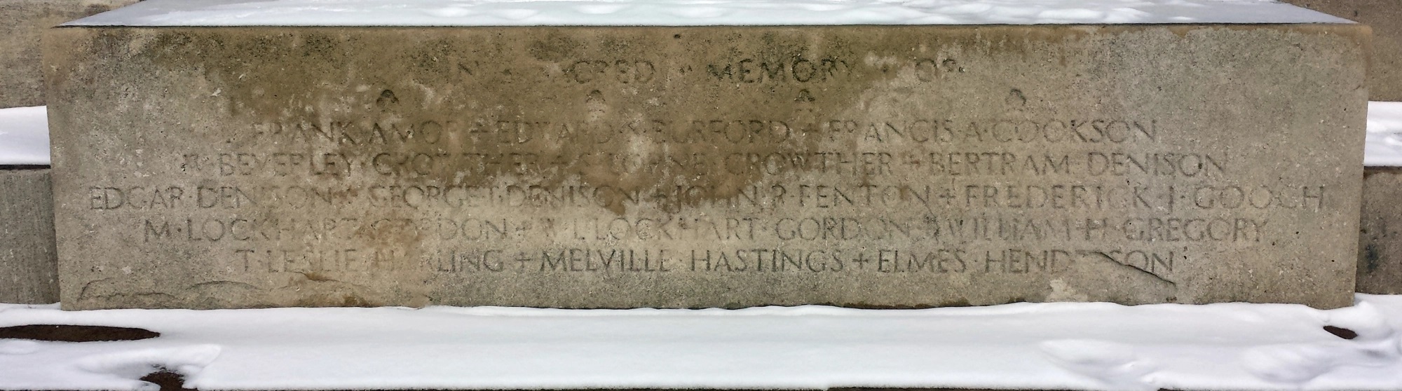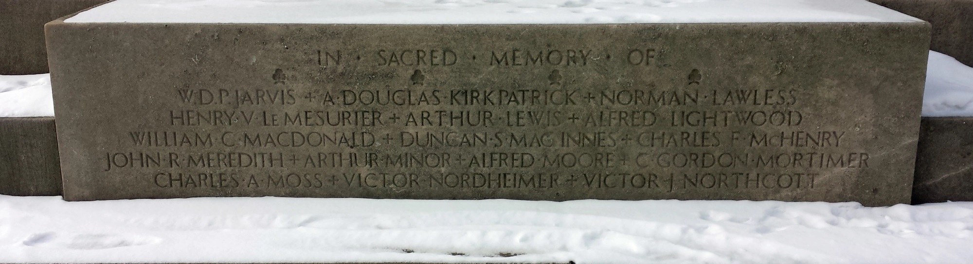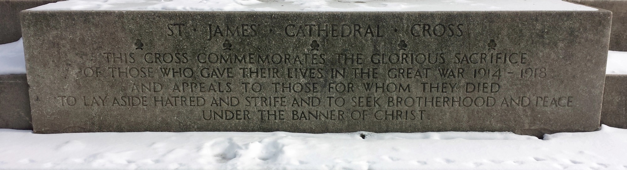 On June 22, 1924, a Memorial Cross was unveiled at the west side of St. James Cathedral to commemorate the memory of the 46 members of the congregation who had fallen in the First World War. One hundred members of the 10th Regiment Royal Grenadiers attended the unveiling ceremony, which was conducted by Colonel A.H. Borden. The memorial was unveiled by H.C. Scholfield and dedicated by Right Reverend Bishop William Day Reeve.