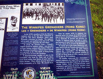 This memorial, which also incorporates a laminated placard with pictures and text, is dedicated to the local war dead and veterans of the First and Second World Wars and the Korean War. It was erected by the citizens of St. Vital.