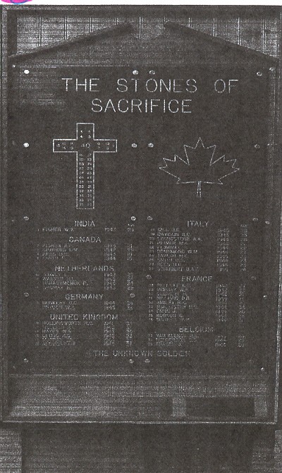 This monument was constructed in 2001 and dedicated on 6 June 2001. Students from Pleasant Valley Secondary school collected stones from the eight countries in which them men from Armstrong/Spallumcheen had died in the Second World War. They collected stones over a three year period from 1999 – 2001. The stones were formed into a cross that points to Memorial Mountain, named in honour of the 39 men of the area who died. The students who helped build the memorial recognized that they knew who the stones represented, but a visitor would not. An interpretive plaque was necessary to show next of kin which rock represented their lost relative. It was designed and built by a succeeding group of Pleasant Valley Secondary School Graduates and dedicated on June 6, 2004 The following are the contributors to this memorial: Richard Lonsdale, Tom Sidney, James Wood, Keith Worden, John Irving, Jim Howe, Wayne Kyle, Larry Hopner, Mat Hassen, Vic Polichek, Pierre Vaudry from the UPS Store Groups, students from Pleasant Valley Secondary School 1999-2004, Armstrong & Spalumcheen Parks & Recreation Commission, Associated Ready Mix, Budget Trophies, Greenscape Landscaping, Meggalt Truckin,g Nor Val Rentals, Otter Lake Sand and Gravel, Shepherds Home Hardware, Vernon Paving, Wood-N-Chick Furniture, and Noble Tractor & Equipment Ltd.